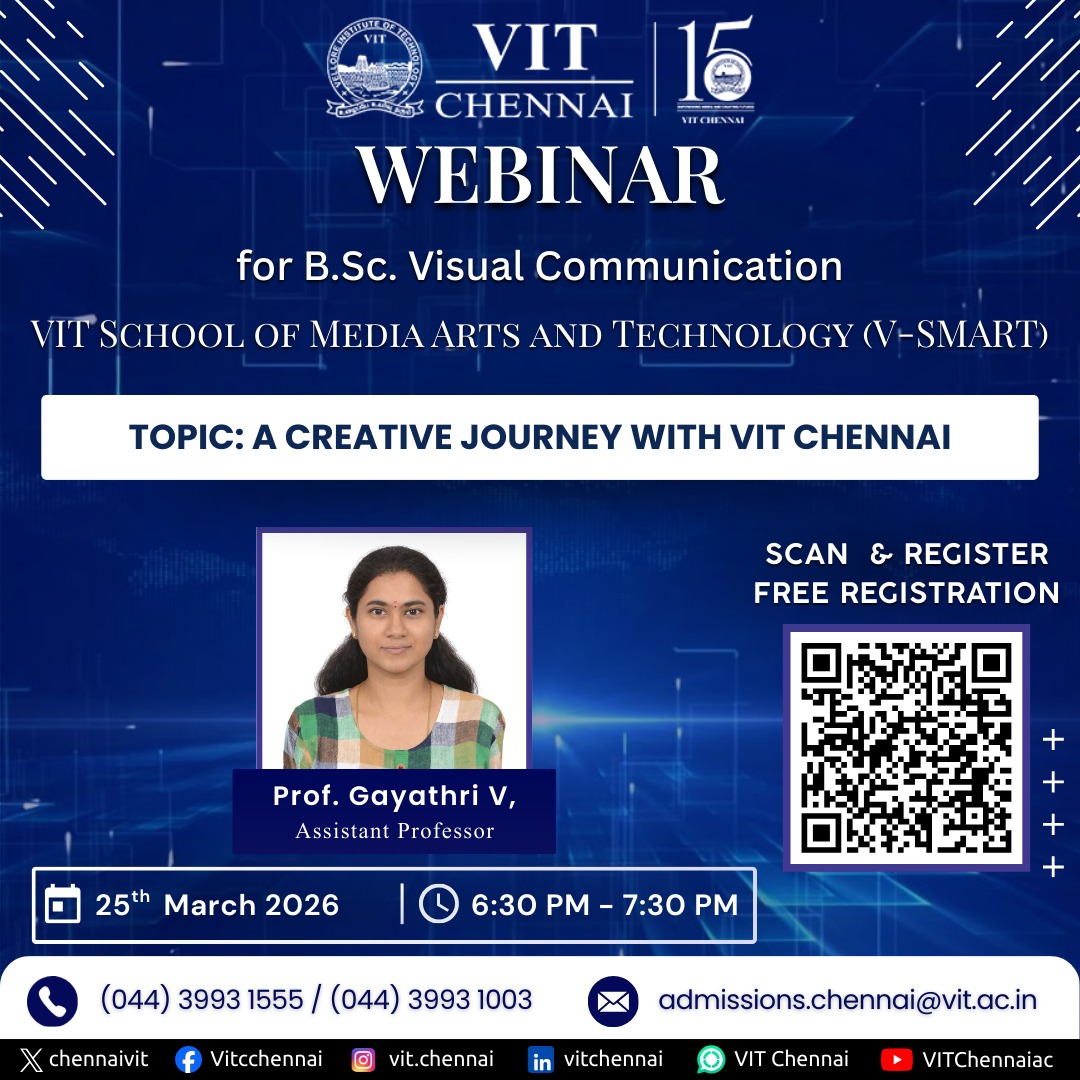 Join our exclusive webinar on “A Creative Journey with VIT Chennai” and explore exciting opportunities in B.Sc. Visual Communication. Gain valuable insights from experienced faculty.