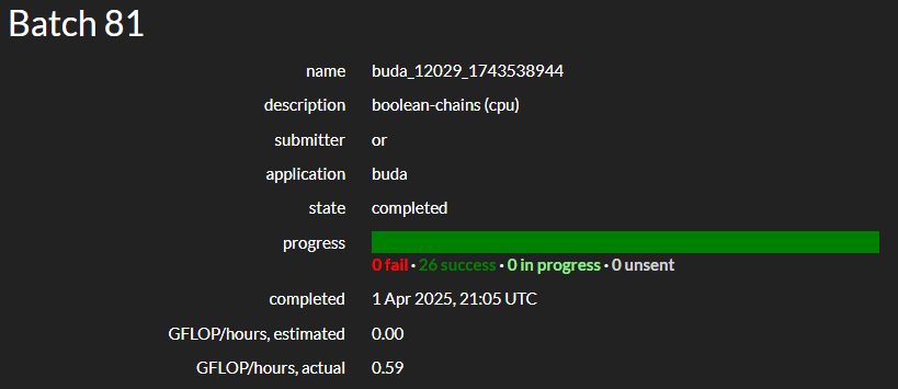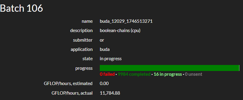 Vitalii Koshura @AenVampire · Jun 1, 2025 The Boolean Chains project (the first hosted by #BOINC Central) has reached a milestone: the search space for N=15, L=21 is done. See a discussion of the results: boinc.berkeley.edu/central/forum_… #DistributedComputing #VolunteerComputing #GridComputing #CitizenScience 1 2 141