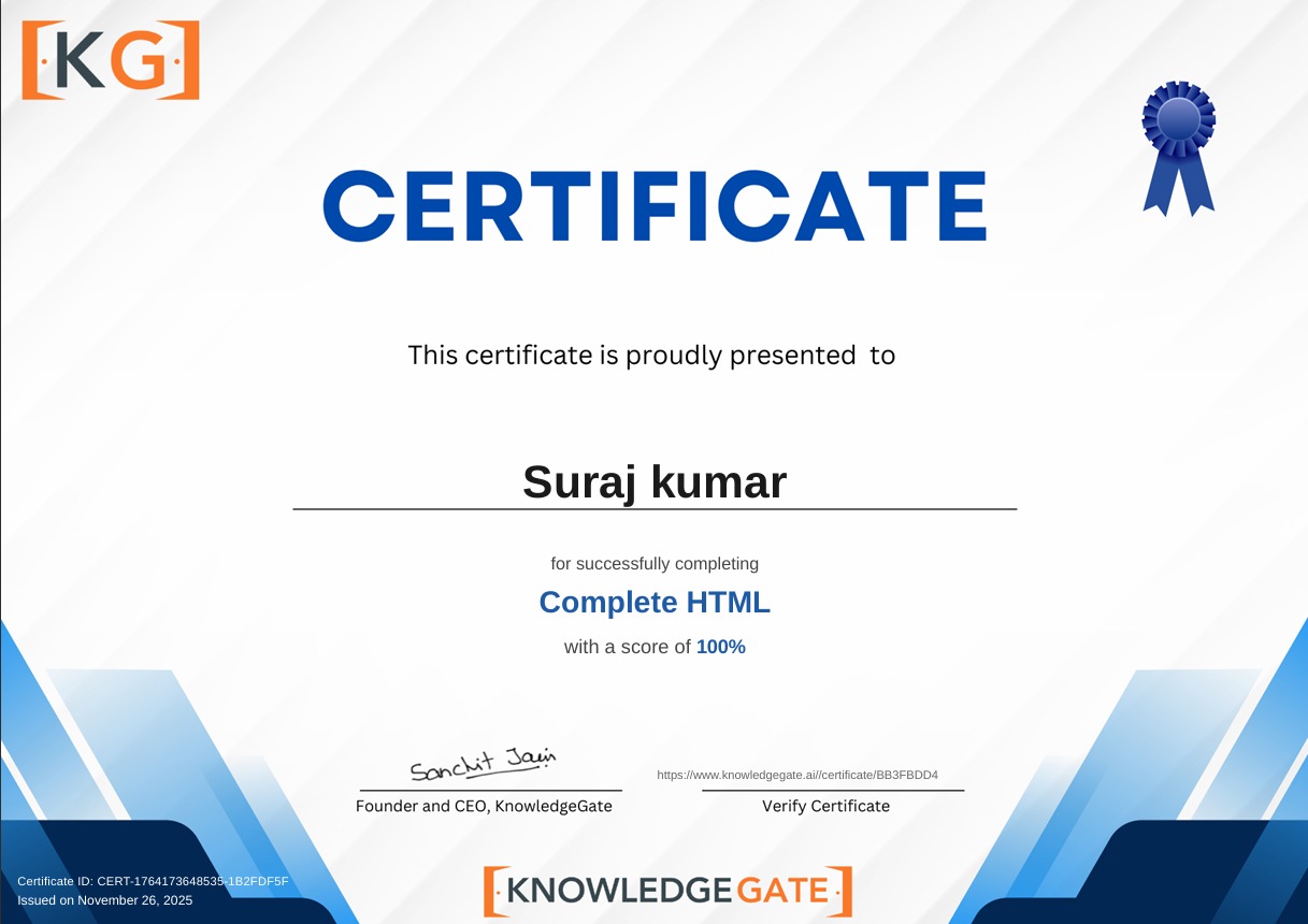 I’m happy to share that I’ve completed the Complete HTML Certification from KnowledgeGate with a 100% score! 💯