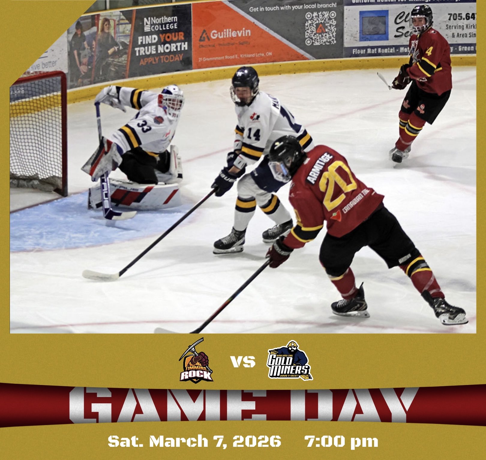 Your Timmins Rock are back in action tonight as they visit the Kirkland Lake Gold Miners - puck drop is 7pm 🏒