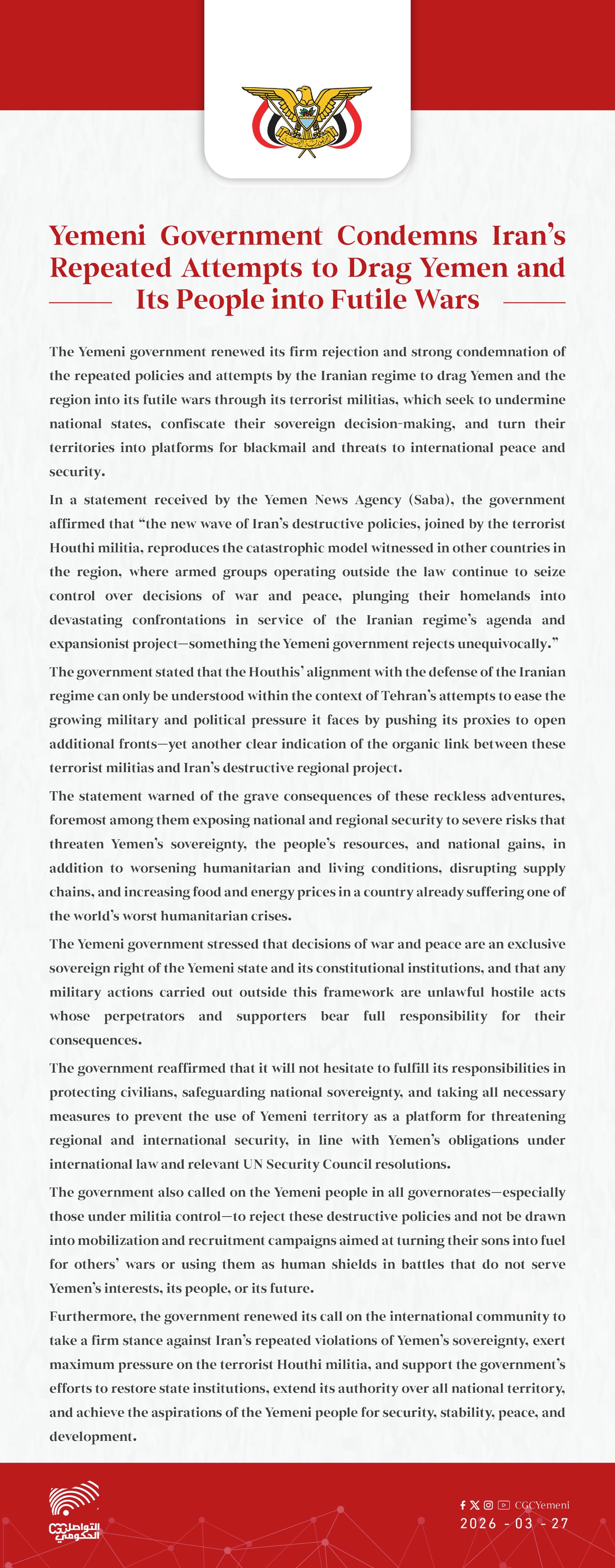 The #Yemeni Government Rejects Iran’s Attempts to Drag #Yemen into Its Proxy Wars and Renews Its Condemnation of These Policies — The Yemeni government rejected the #Iranian regime’s attempts to drag Yemen into its wars through its proxy militias and renewed its condemnation of atement, the government warned of the consequences of these “reckless and ill-considered adventures,” calling on the Yemeni people to reject them and not to respond to the mobilization calls issued by the Houthi militia.