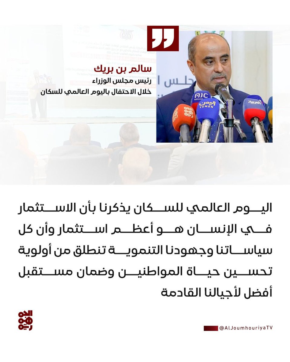 رئيس الوزراء سالم بن بريك خلال الاحتفال باليوم العالمي للسكان: اليوم العالمي للسكان يذكرنا بأن الاستثمار في الإنسان هو أعظم استثمار وأن كل سياساتنا وجهودنا التنموية تنطلق من أولوية تحسين حياة المواطنين وضمان مستقبل أفضل لأجيالنا القادمة