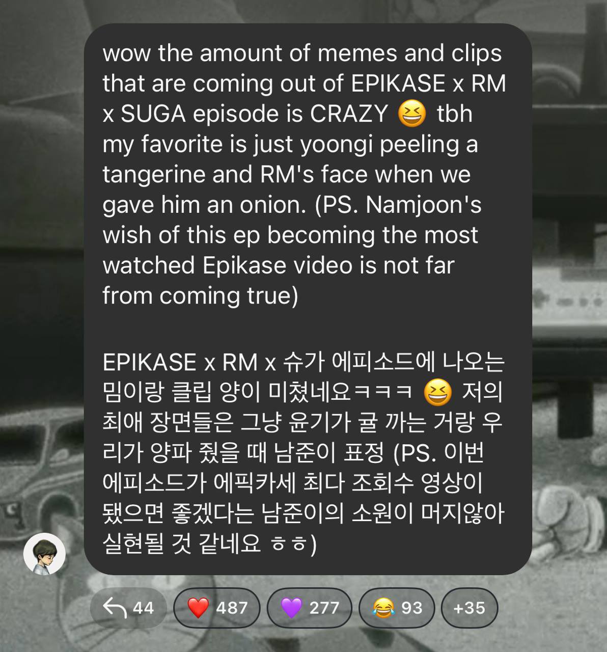 👤: wow, la cantidad de memes y videos que han aparecido después del episodio de EPIKASE x RM x SUGA es simplemente INCREÍBLE 😆 Honestamente, mi momento favorito es cuando Yoongi está pelando un mandarín y la cara d beso. (P.D. El deseo de Namjoon de que este episodio se convierta en el video más visto de Epikase ya está cerca de hacerse realidad).