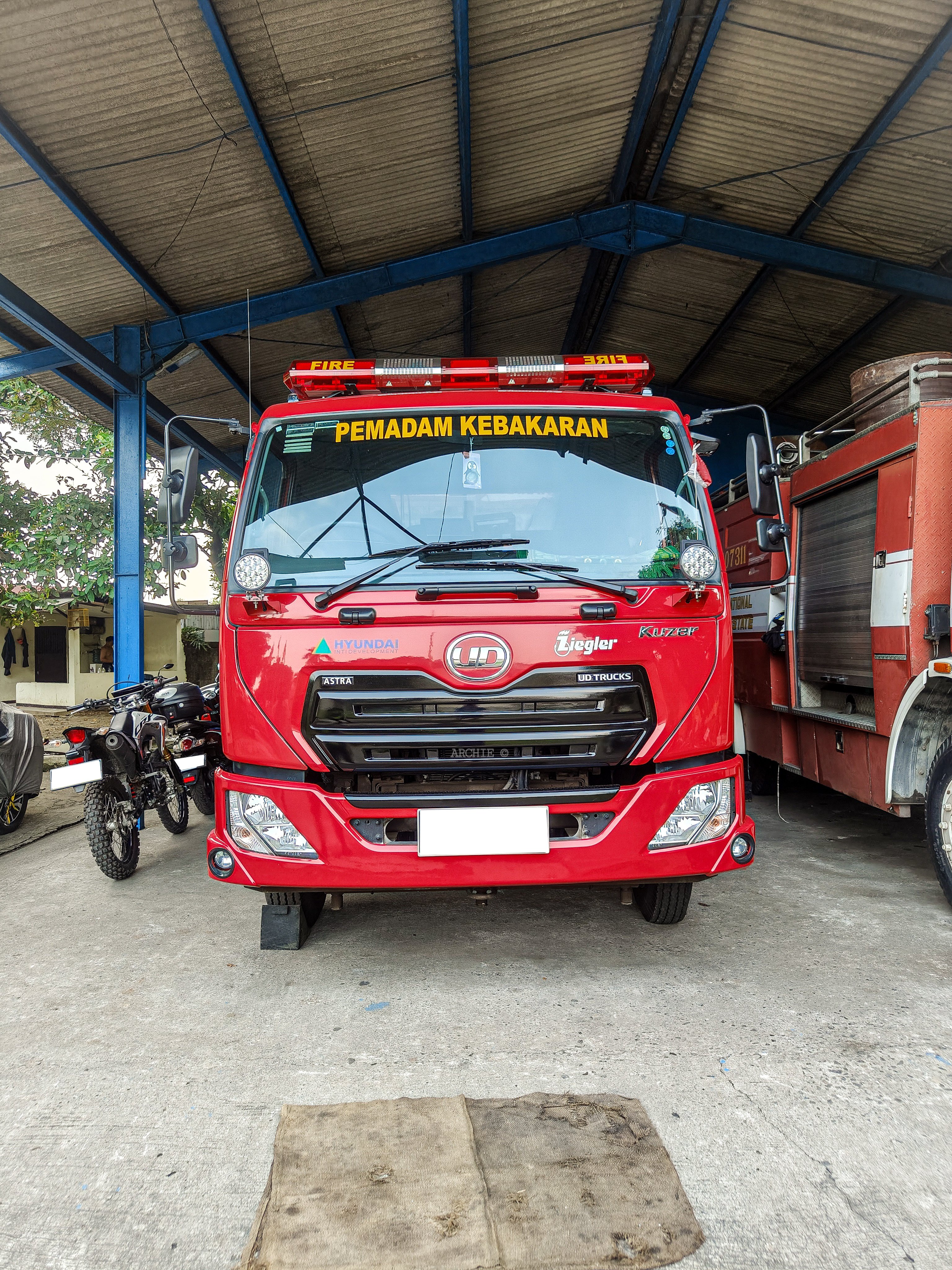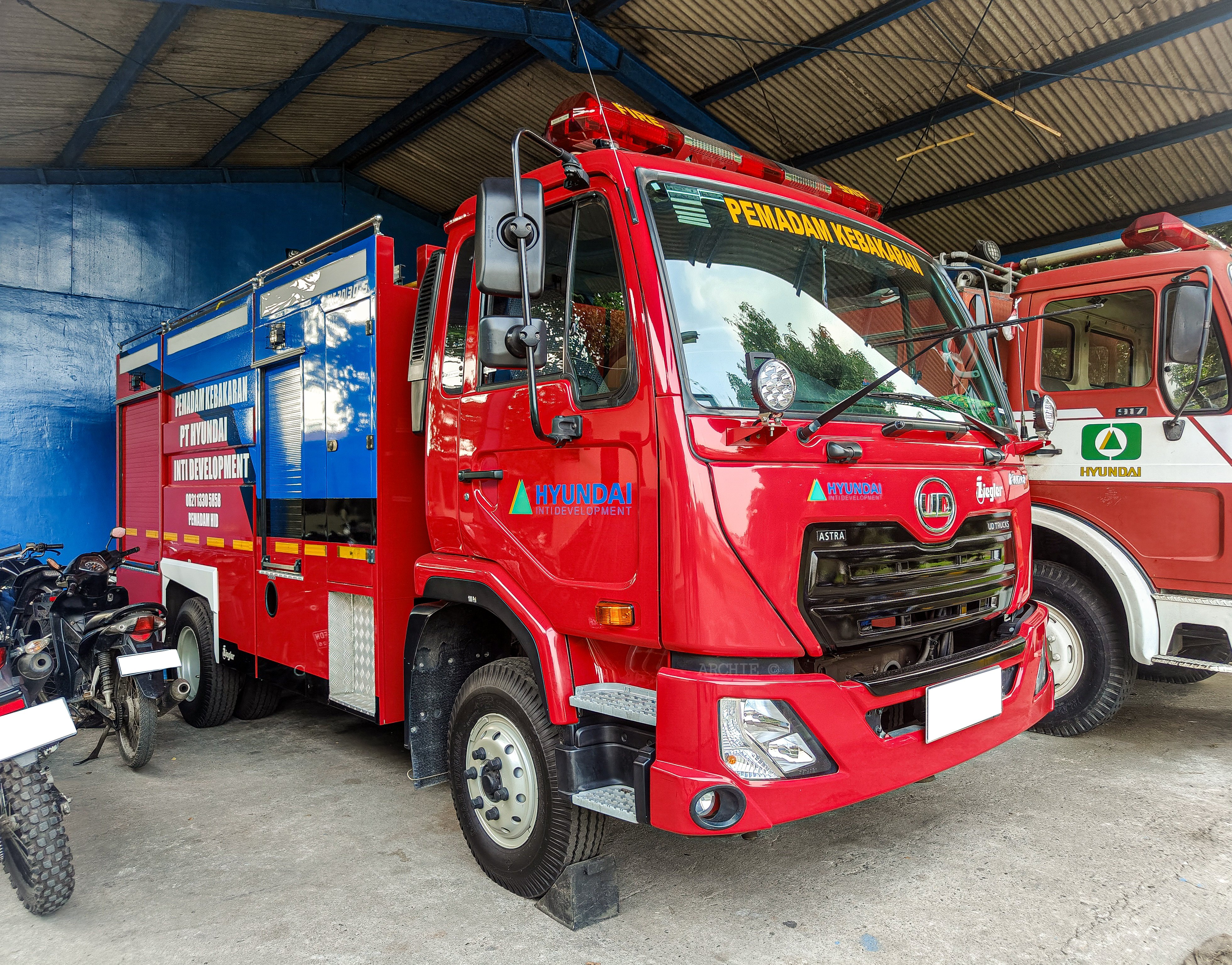 Truk damkar kawasan industri hyundai, Unit Pompa air + foam UD Trucks Kuzer RKE 150 buatan karoseri Ziegler #udtrucks#UDトラックス#ziegler#damkar#firefighter#Brandweer#消防車