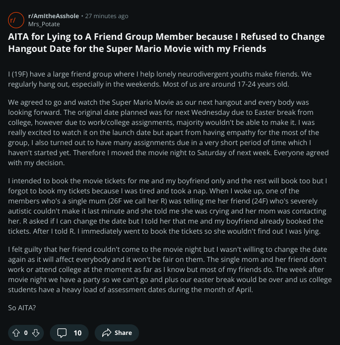AITA for Lying to A Friend Group Member because I Refused to Change Hangout Date for the Super Mario Movie with my Friends