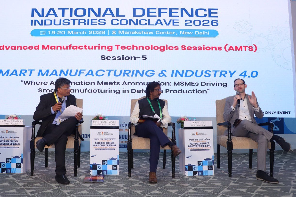 At the National Defence Industries Conclave 2026, a session on “Where #Automation Meets #Ammunition: #MSMEs Driving Smart Manufacturing in #DefenceProduction” under Smart Manufacturing & Industry 4.0 highlighted the transformative role of advanced manufacturing technologies in defeincluding experts from @DRDO_India, @iitmadras and global industry deliberated on how automation, precision engineering & Industry 4.0 solutions are enabling MSMEs to enhance efficiency, innovation & quality in defence production.