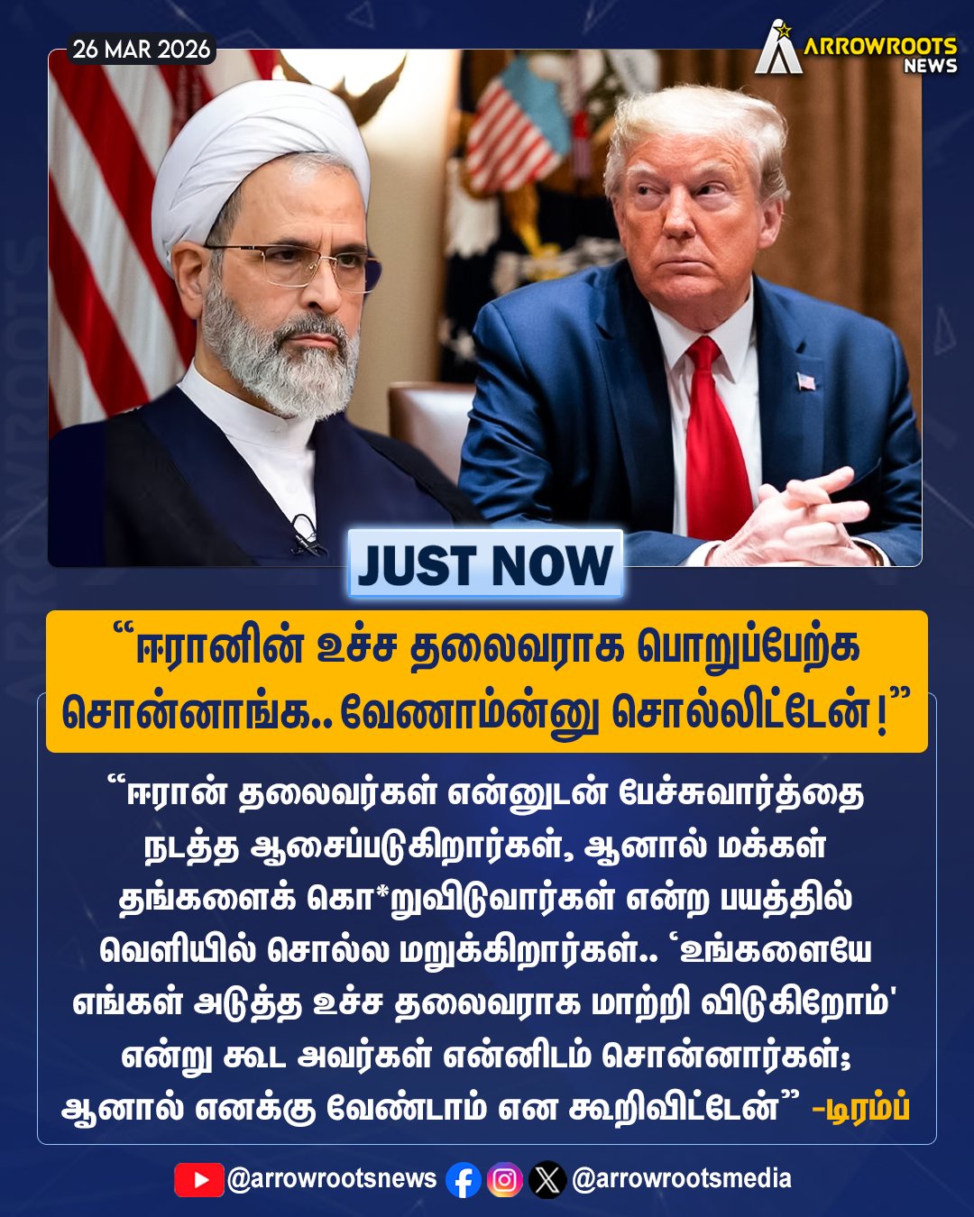 Arrowroots Media @arrowrootsmedia · 2d "ஈரானின் உச்ச தலைவராக பொறுப்பேற்க சொன்னாங்க.. வேணாம்ன்னு சொல்லிட்டேன் !" #iran #donaltrump #arrowroots 16