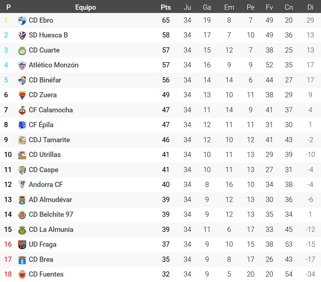 Moisés Tejedor D. @moisestejed · May 11, 2025 #3ªFederación #Grupo17º -#Asciende: @CD_Ebro (1º). -#FaseAscenso: @FundAlcoraz @SDHuesca B (2º), @cdcuarte (3º), @AtcoMonzon (4º) y @cdbinefar (5º). -#Descienden: #UDFraga (16º), @cd_brea (17º) y @CDFuentesOf (18º). Clasificación vía @futbolmeoficial. 2 353