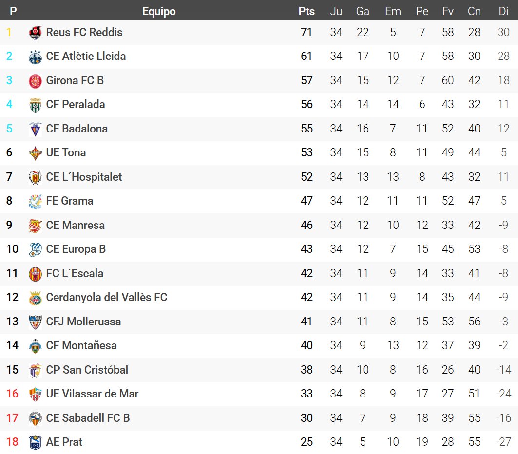Moisés Tejedor D. @moisestejed · May 11, 2025 #3ªFederación #Grupo5º* -#Asciende: @ReusFCR (1º). -#FaseAscenso: @atletic_lleida (2º), @GFCAcademia (3º), @CFPeralada (4º) y @cfbadalonasad (5º). -#Descienden: @UEVilassardeMar (16º), @FutBaseCES (17º) y @aeprat1945 (18º). Clasificación vía @futbolmeoficial. 1 4 931