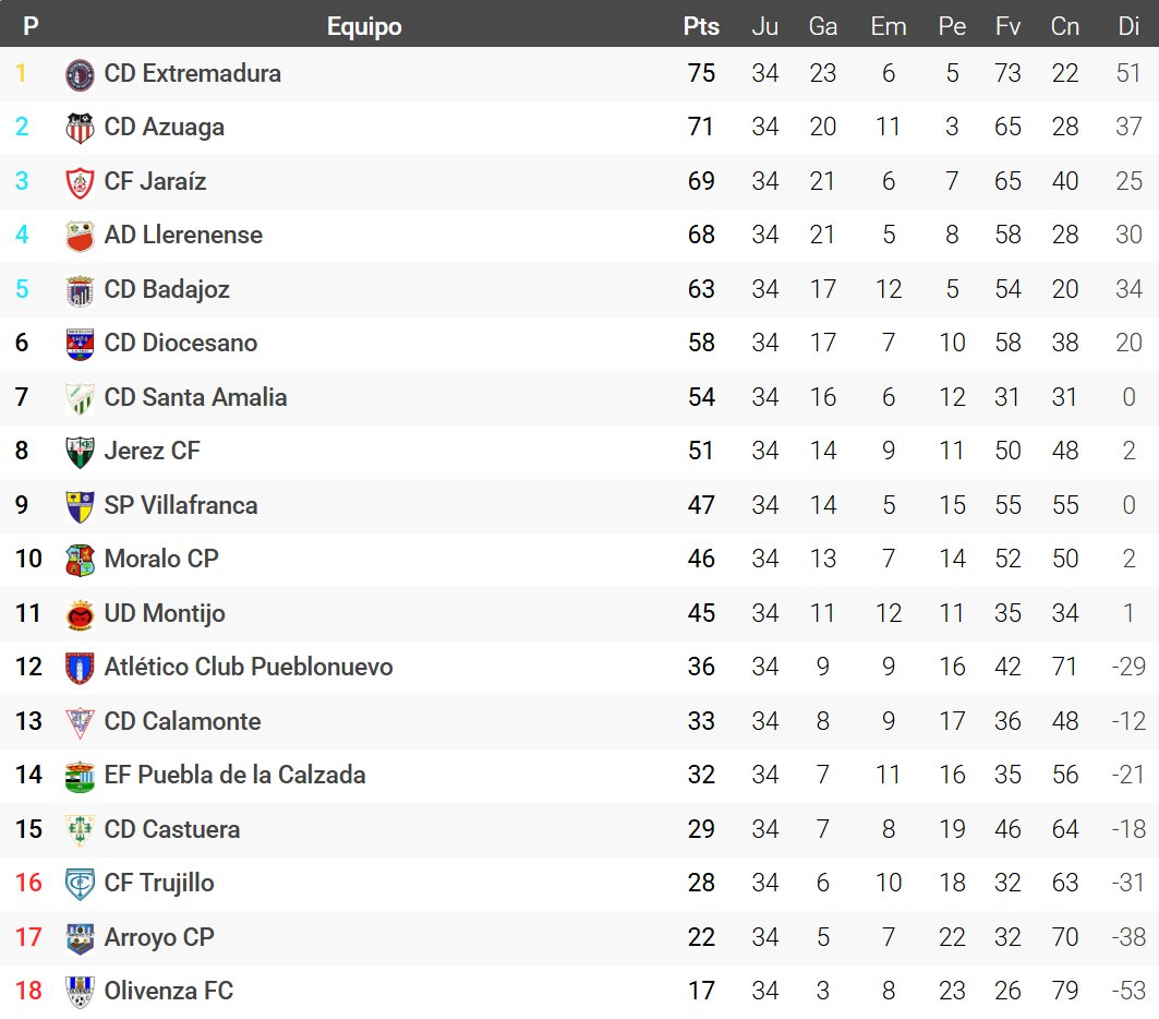Moisés Tejedor D. @moisestejed · May 11, 2025 #3ªFederación #Grupo14º* -#Asciende: @CDExt1924 (1º). -#FaseAscenso: @cdazuaga (2º), @cfjaraiz (3º), @adllerenenseof (4º) y @CDBadajoz (5º). -#Descienden: @Trujillo_CF (16º), @arroyo_cp (17º) y @OlivenzaF_C (18º). Clasificación vía @futbolmeoficial. 1 4 9 3.1K