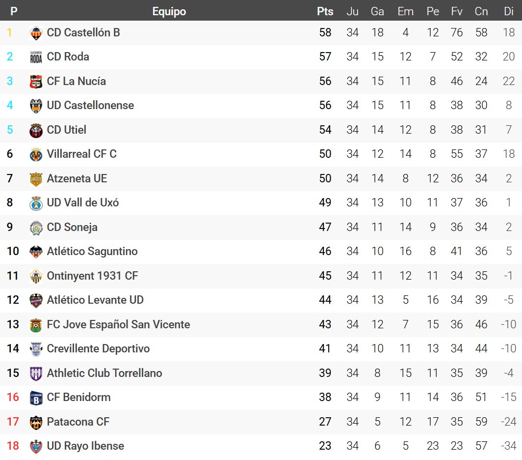 Moisés Tejedor D. @moisestejed · May 11, 2025 #3ªFederación #Grupo6º* -#Asciende: @CDCS_Academy (1º). -#FaseAscenso: @cdroda (2º), @cfnucia (3º), @UDECastello (4º) y #CDUtiel (5º). -#Descienden: @RCFBenidorm (16º), @patacona_cf (17º) y #UDRayoIbense (18º). Clasificación vía @futbolmeoficial. 1 1 2 802