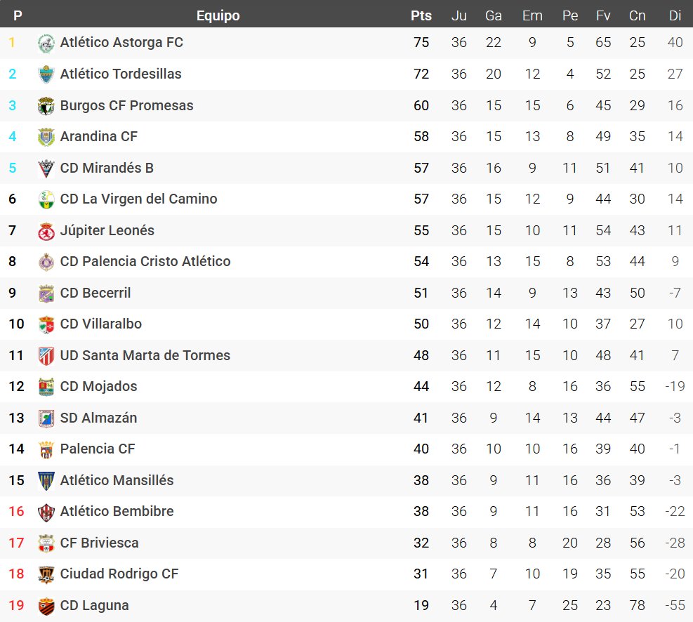 Moisés Tejedor D. @moisestejed · May 11, 2025 #3ªFederación #Grupo8º -#Asciende: @AtleticoAstorga (1º). -#FaseAscenso: @AtcoTordesillas (2º), @LaFactoriaBCF #BCFPromesas (3º), @ArandinaCF (4º) y @CDMirandes B (5º). -#Descienden: @AtcoBembibre (16º), @cfbriviesca (17º), @CiudadRodrigoCF (18º) y @CDLaguna_Info (19º). 1 2 3 2K
