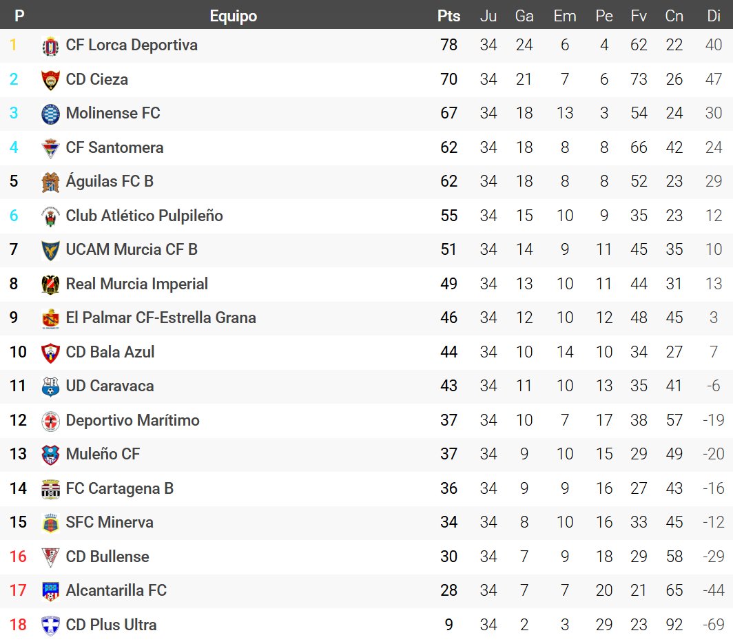 Moisés Tejedor D. @moisestejed · May 11, 2025 #3ªFederación #Grupo13º -#Asciende: @lorcadeportiva (1º). -#FaseAscenso: @cdcieza_ (2º), @UnionMolinense (3º), @CFSantomera1 (4º) y @pulpileatletico (6º)*. -#Descienden: @bullense1931 (16º), @AlcantarillaFC (17º) y @CDPlusUltra (18º). Clasificación vía @futbolmeoficial. 1 1 425