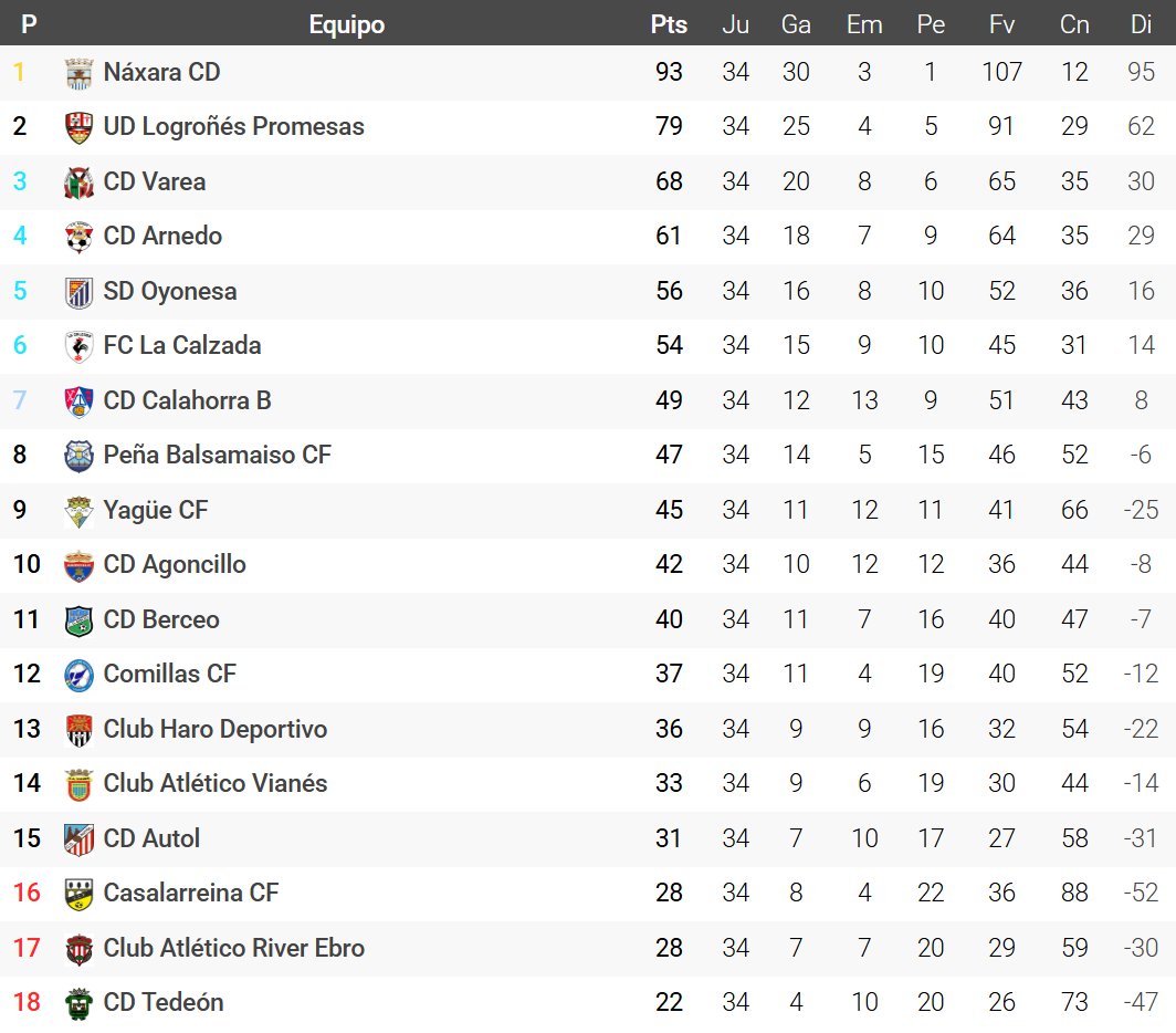 Moisés Tejedor D. @moisestejed · May 11, 2025 #3ªFederación #Grupo16º* -#Asciende: @Naxaracd (1º). -#FaseAscenso: @cdvarea (3º), @CDArnedo (4º), @SDOyonesa (5º) y @FCLaCalzada (6º)**. -#Descienden: @cdcalahorra B (7º)*** 1 404