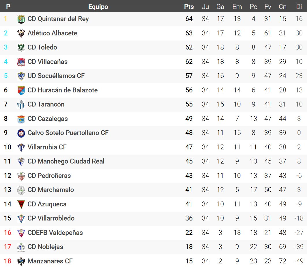 Moisés Tejedor D. @moisestejed · May 11, 2025 #3ªFederación #Grupo18º -#Asciende: @cdquintanardrey (1º). -#FaseAscenso: @AcademiaABP #AtléticoAlbacete (2º), @CD_Toledo (3º), @cd_villacanas (4º) y @YugoUDS (5º). -#Descienden: @CD_Valdepenas (16º), @CDNoblejas (17º) y @Manzanares_CF_ (18º). Clasificación vía @futbolmeoficial. 1 477