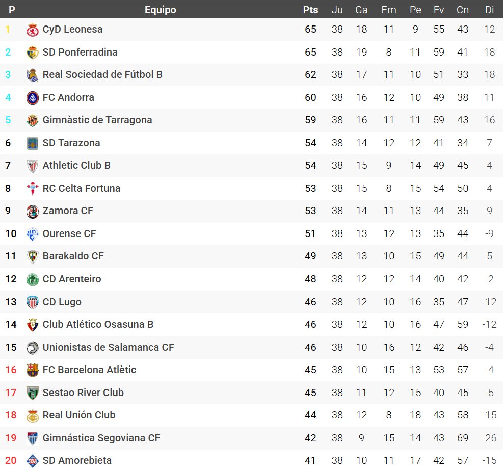 Moisés Tejedor D. @moisestejed · May 24, 2025 #1ªFederaciónVersusELearning #Grupo1º -#Asciende: @CyDLeonesa (1º). -#FaseAscenso: @SDP_1922 (2º), @RealSociedad B (3º), @fcandorra (4º) y @NASTICTARRAGONA (5º). -#Descienden: @FCBarcelonaB (16º), @SestaoRC (17º), @REALUNIONCIRUN (18º), @lagimnastica (19º) y @SDAmorebieta (20º). 1 398