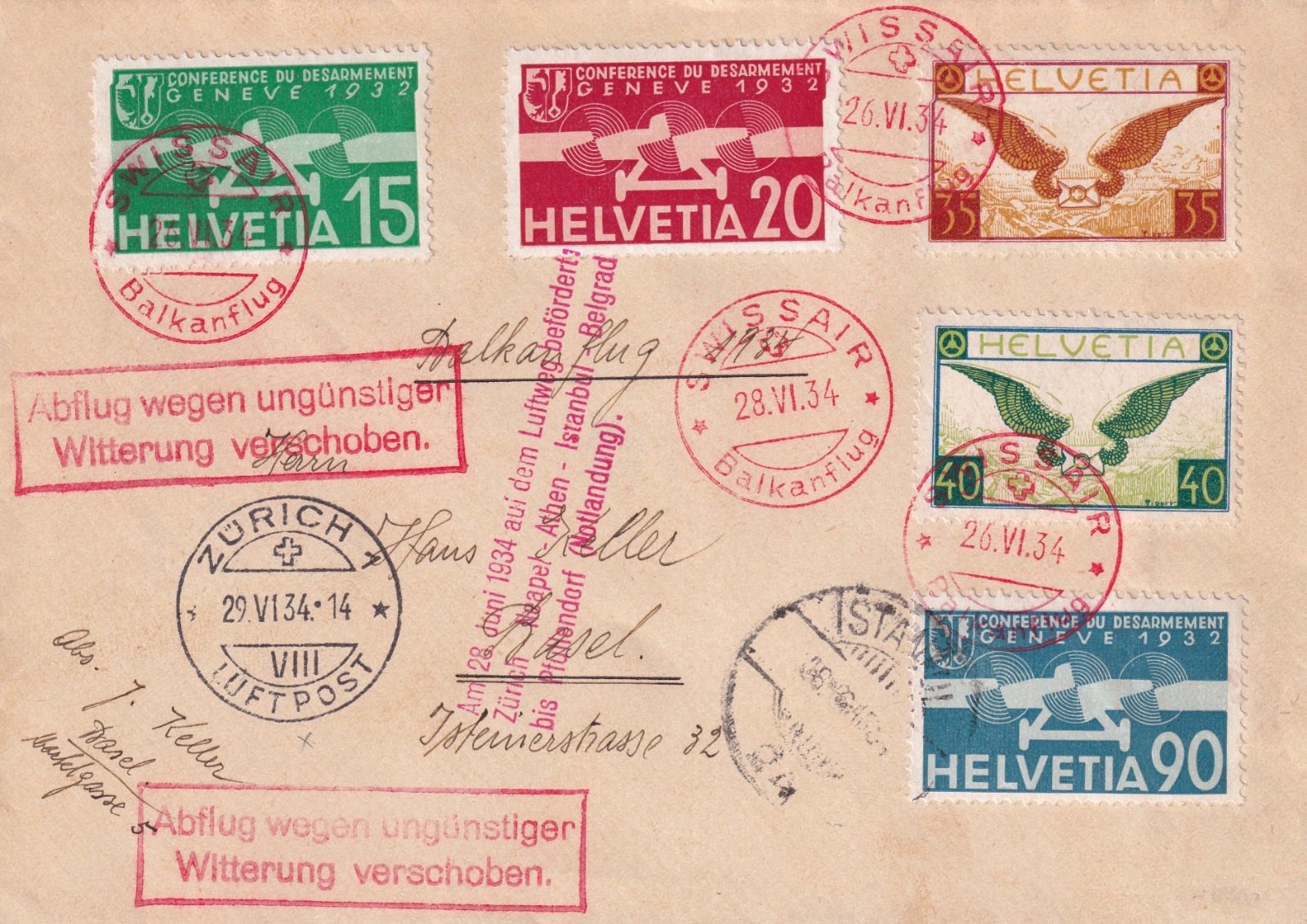 1934 İsviçre pullu Balkan Uçuşu damgalı, İSTANBUL geçişli postadan geçmiş zarf