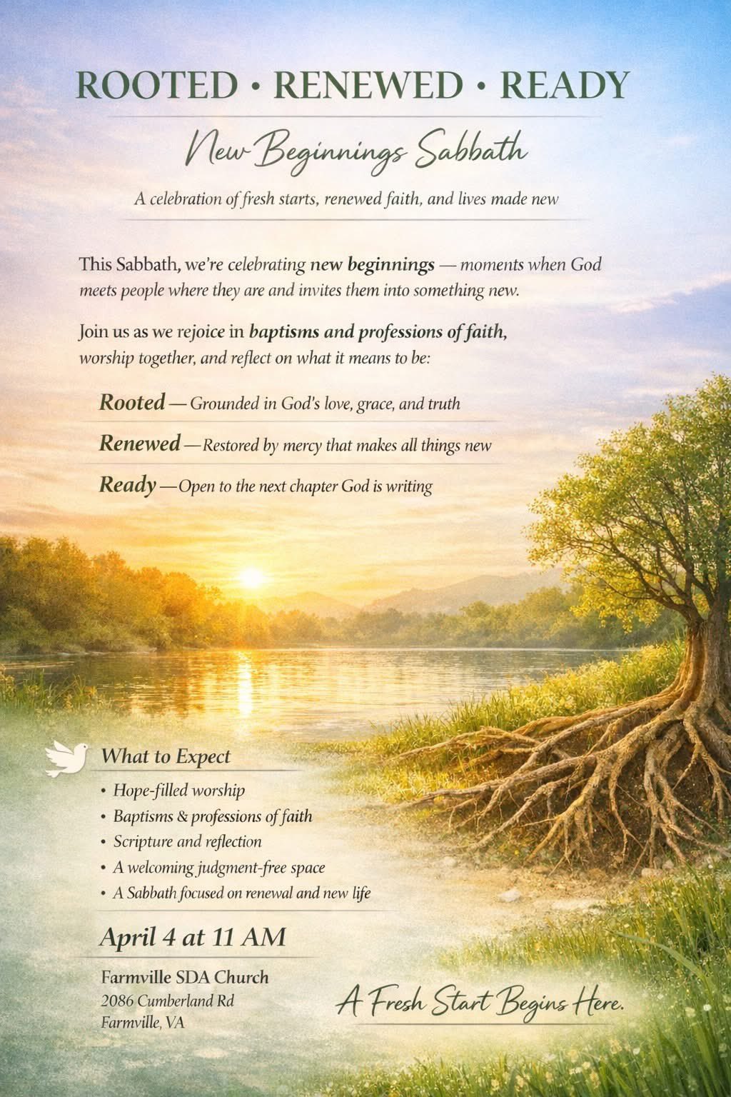 Join us for New Beginnings Sabbath—celebrating fresh starts, baptisms, and renewed faith.