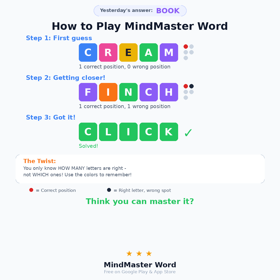 Yesterday's answer: FELLOW 🎓 Saturday Tutorial Time! Learn tips & tricks to master MindMaster Word puzzles. Level up your word game skills! 🆓 Free on Google Play & App Store #MindMasterWord #WordGame #BrainTeaseZJ