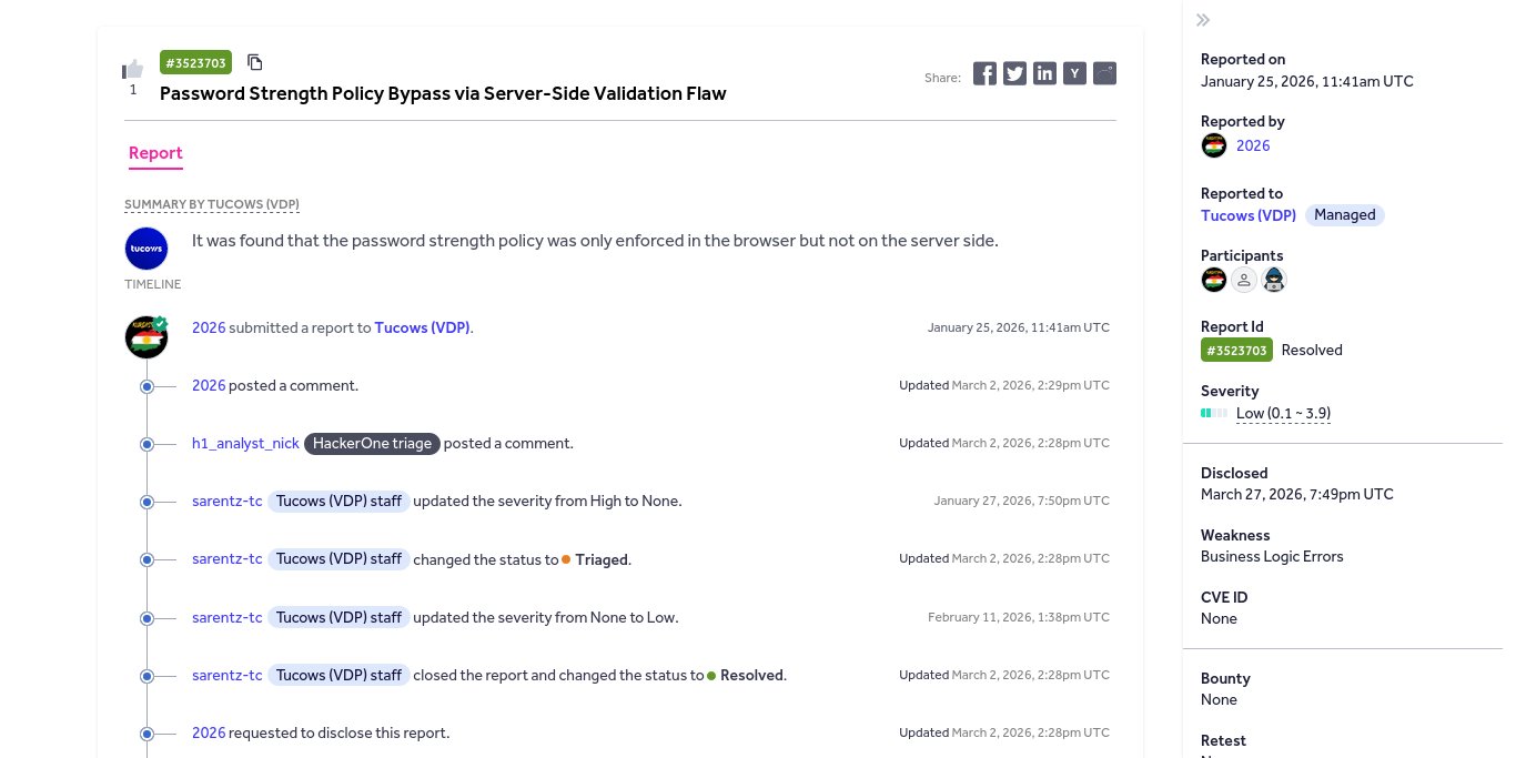 From medium.comIt was found that the password strength policy was only enforced in the browser but not on the server side.