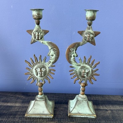 From audible.comSet of 2 Celestial Taper Candle Holders Sun Moon Stars Metal Verdigris Patina No chips or cracks. All over Verdigris patina. Light scuffs. Pre-owned condition. Please see pictures for reference.