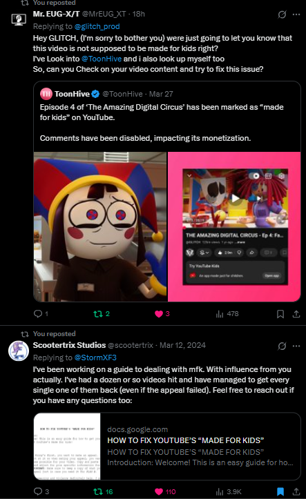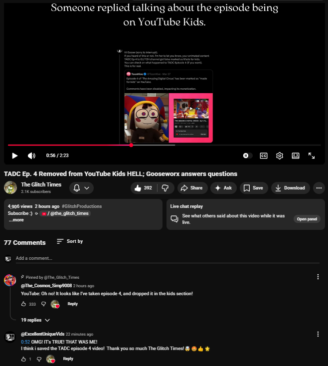 I'm just going to let you all know that I think I've saved GLITCH's and Gooseworx's video of Episode 4 to solve and remove against false marked Made for Kids. [more replies myself here] #theamazingdigitalcircus#changed#savedtheday#announcement