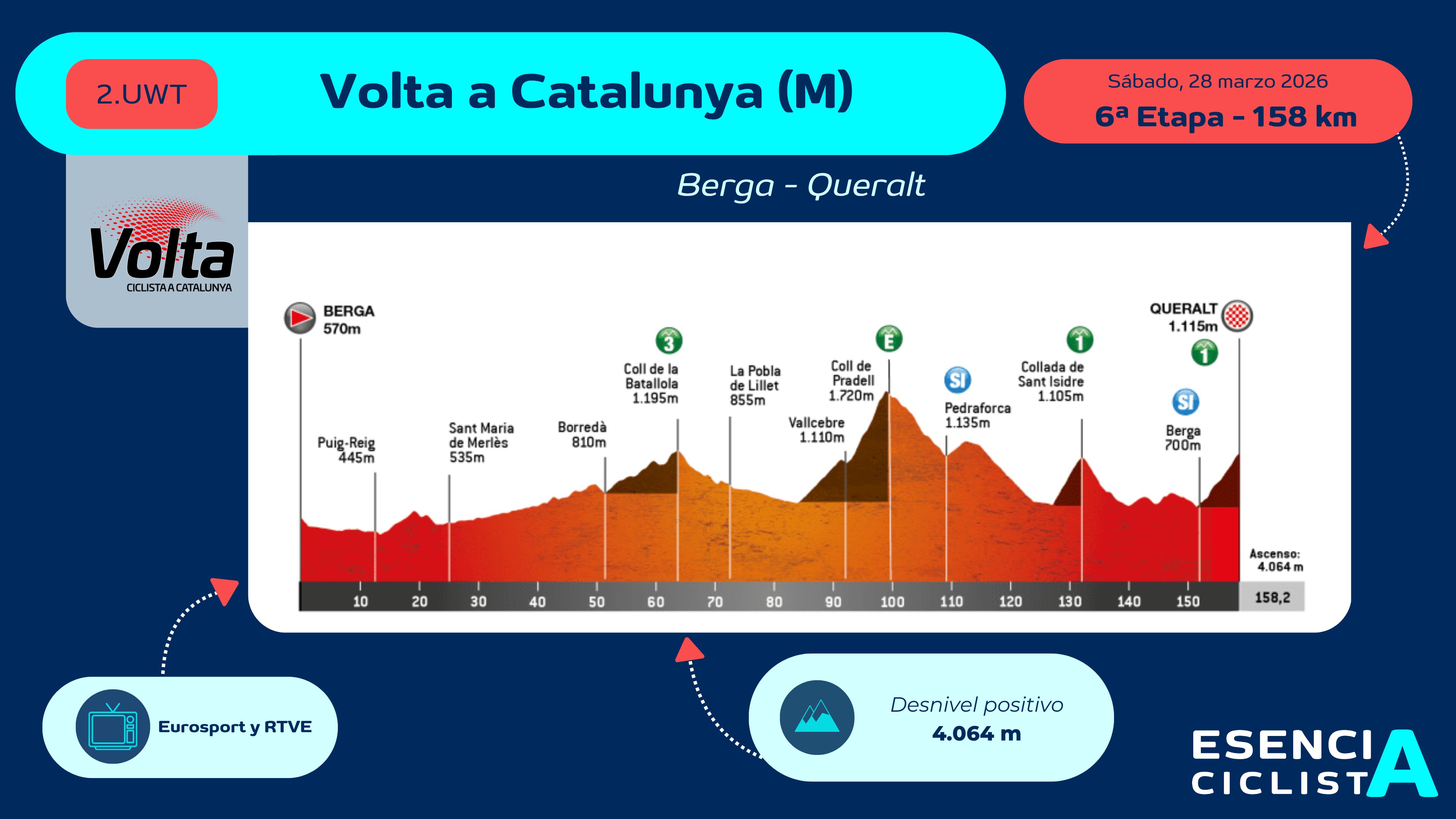 Previa etapa 6 de la Volta a Catalunya 2026: perfil Berga-Queralt, claves del Coll de Pradell y favoritos. Vingegaard domina; Gall, Lipowitz y Martínez al acecho.