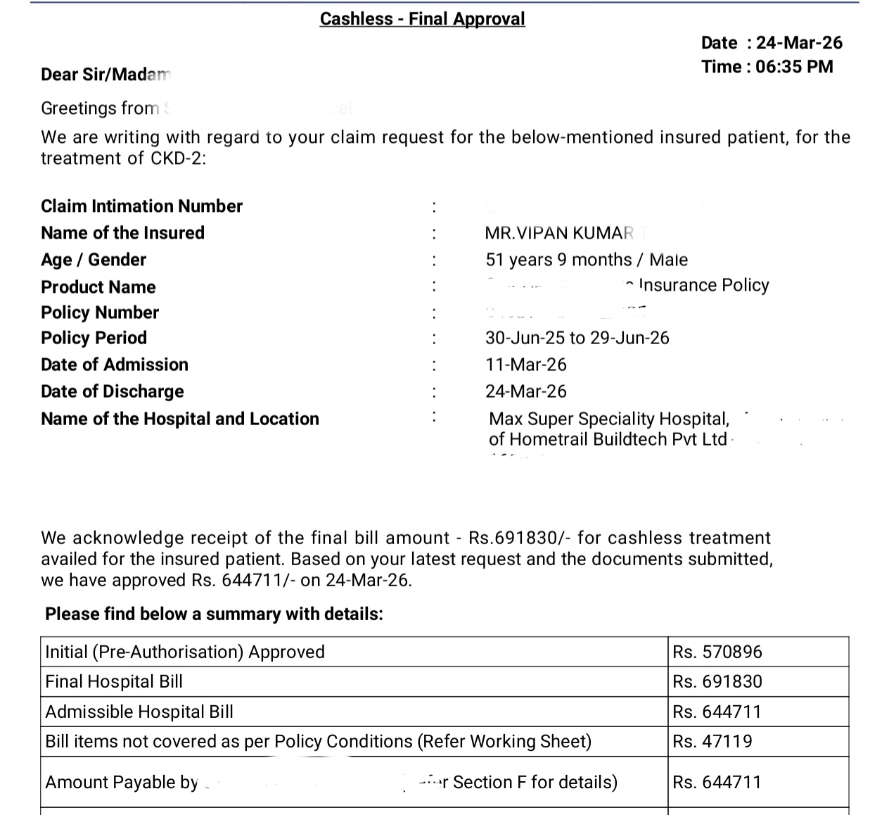 Bills & policy clauses submitted as proof
