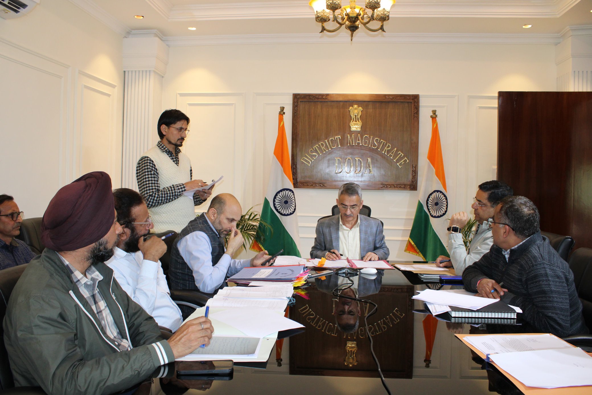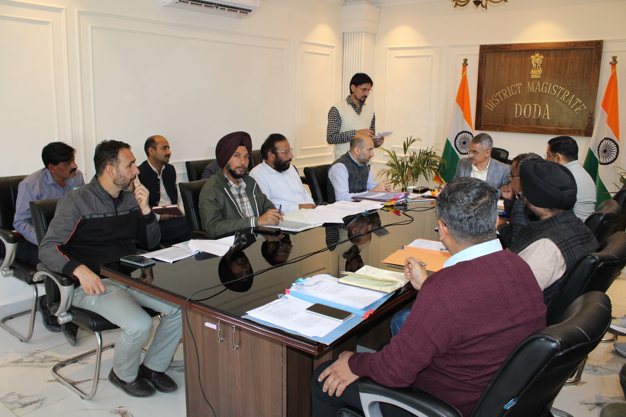 Stresses timely, transparent disposal per rules. Attendees incl ACR, ACP, Tehsildar & EE PWD. #Poonch#CLU@diprjk