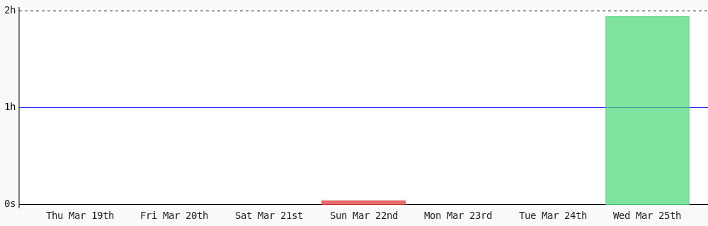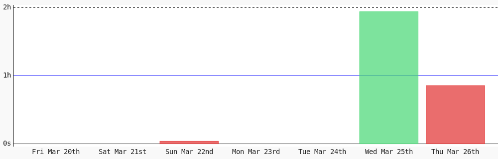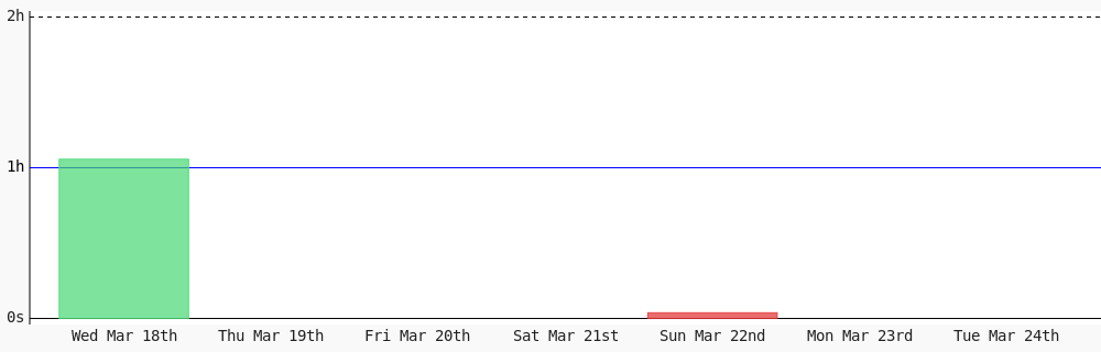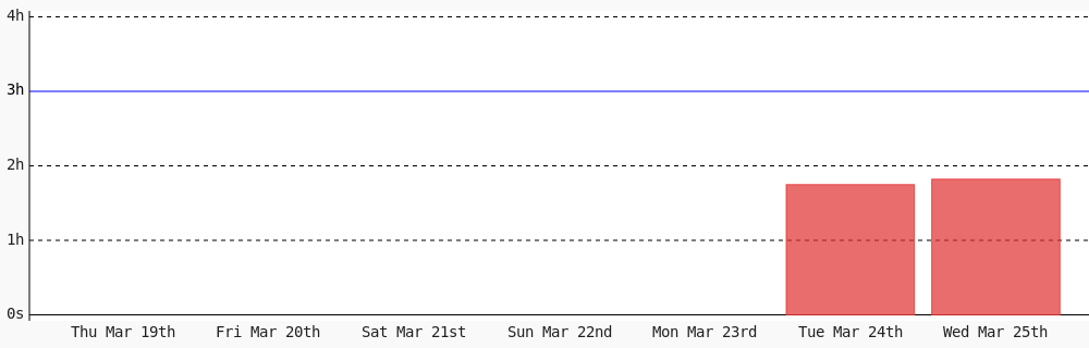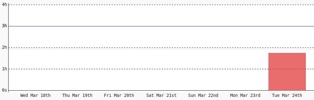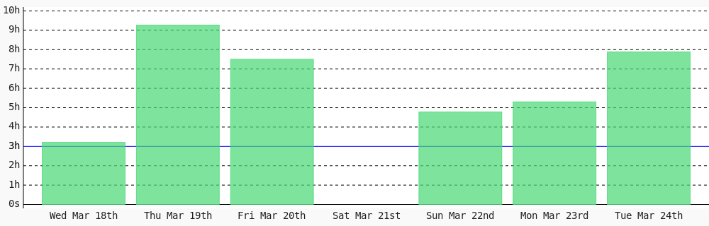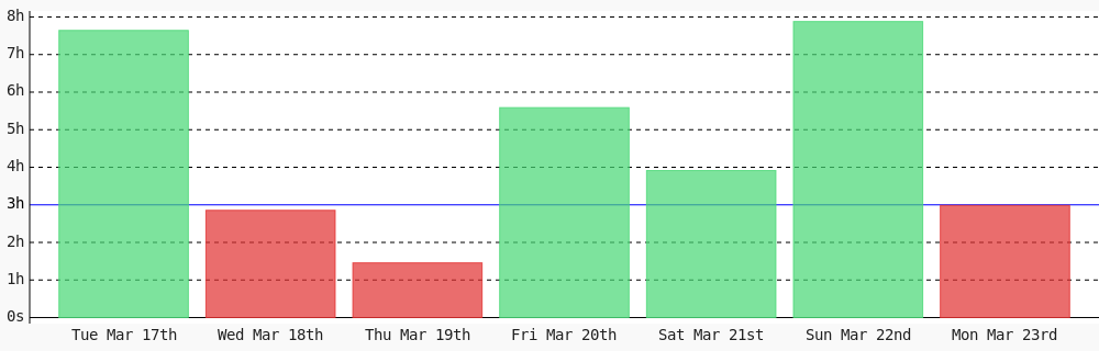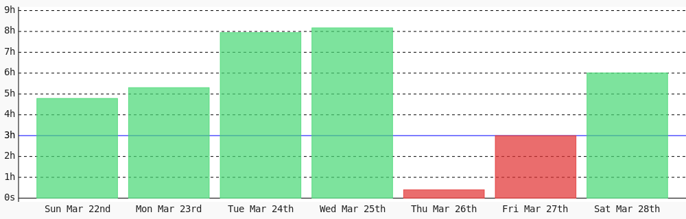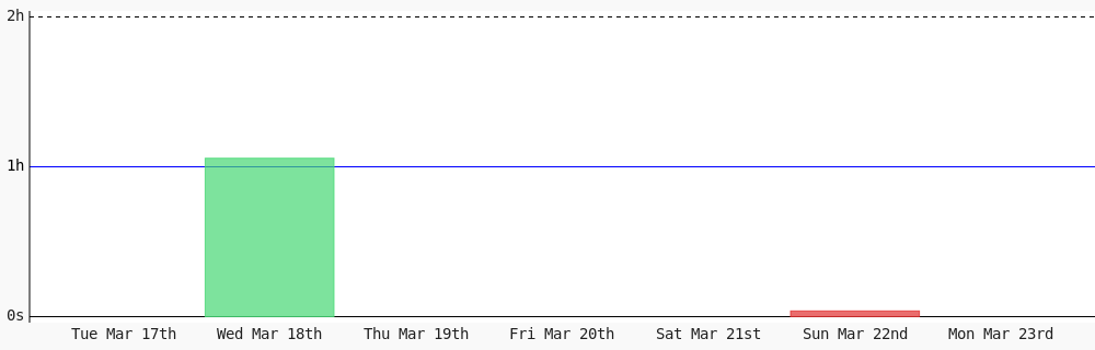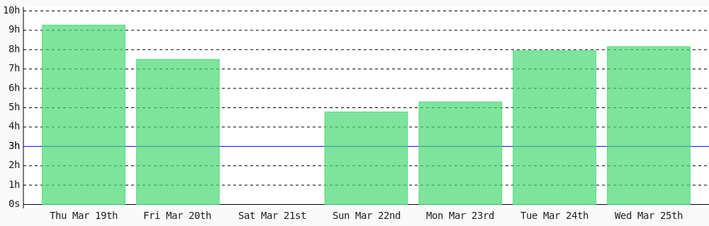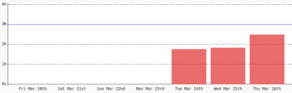 Aman Nadeem @amannadeem78 · 4d Day 462 of #100DaysOfCode. Today I coded 1 hr 44 mins towards my @WakaTime goal of coding 3 hrs per day except sunday #LearnToCode #codegoal #devlife #programming wakatime.com/@daai 1