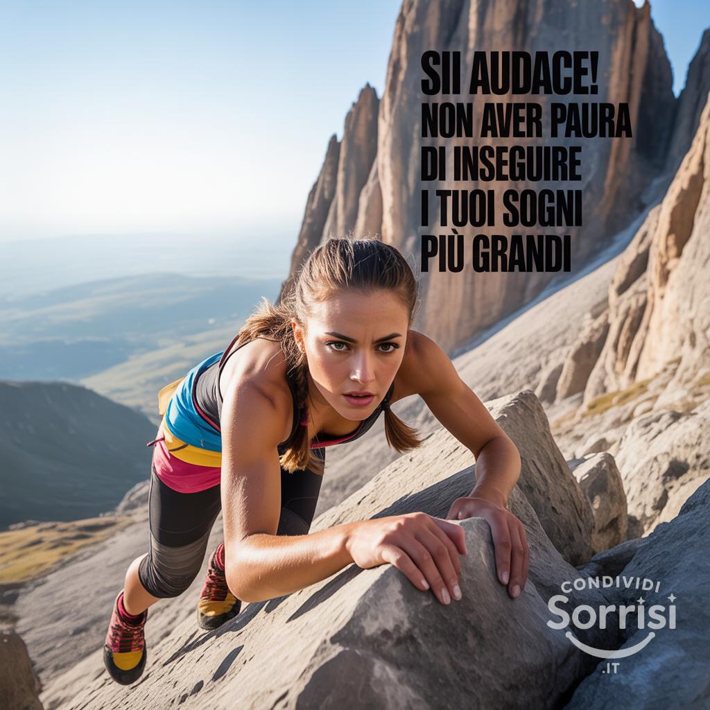 Sii audace! 🚀 Insegui i tuoi sogni più grandi. Fotorealismo motivazionale, colori vividi, prospettiva dal basso, luce solare. Ispirazione e coraggio. 💪✨ #motivazione #ispirazione #coraggio #sogncondividisorrisi.it/immagini-afori…t3u