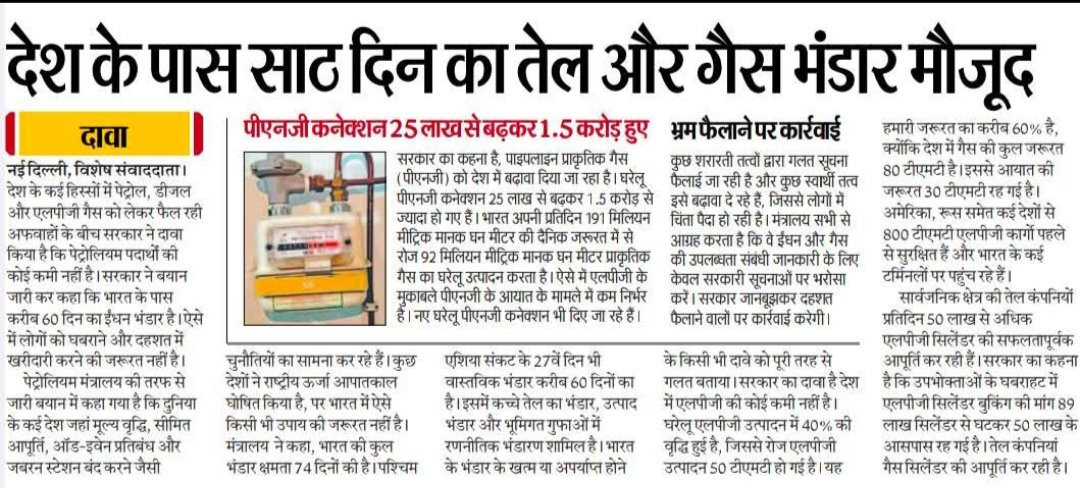 देश के ऊपर कोई ऊर्जा संकट नहीं आने वाला क्योंकि 60 दिनों का एलपीजी और तेल देश के पास उपलब्ध है । ऐसे समय में जब विश्व के कई देश कीमतों में वृद्धि कर रहे हैं, ऑड-इवेन सिस्टम लागू कर रहे वहीं भारत में ऐसा कुछ भी नहीं हो रहा। धीरज धर्म मित्र अरु भाई । आपद काल परखिए चारी।। #Current