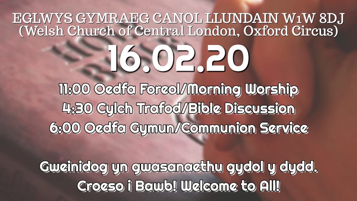 eBusiness4Wales @business4wales · Feb 14, 2020 Top story: @eglwysgymraeg: '16.02.20 11:00 Oedfa Foreol/Morning Worship 4:30 Cylch Trafod/Bible Discussion 6:00 Oedfa Gymun/Communion Service Gweinidog yn gwasanaethu gydol y dydd. Croeso i Bawb! Welcome to All! #cymr… pic.x.com/2knMxhukJT, see more tweetedtimes.com/business4wales…