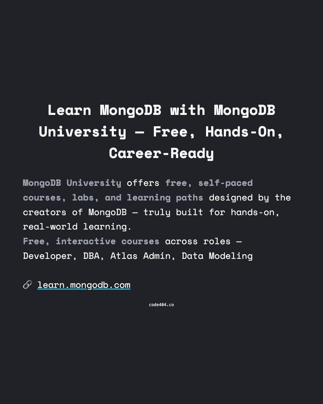 MongoDB University offers free, self-paced courses, labs, and learning paths designed by the creators of MongoDB — truly built for hands-on, real-world learning.