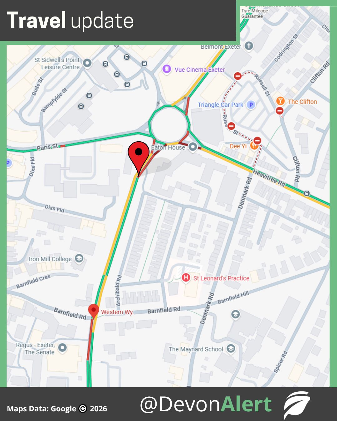 Western Way near Paris Street roundabout towards Barnfield Road in Exeter. It is awaiting recovery. There is congestion in the surrounding area so please approach with caution. AW @StagecoachSW@BBCDevon