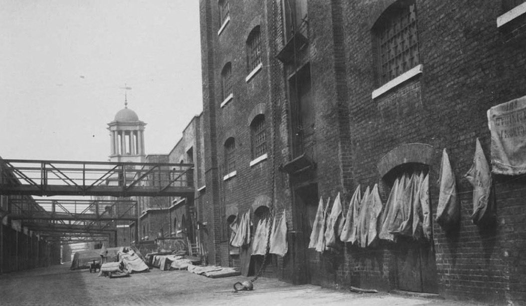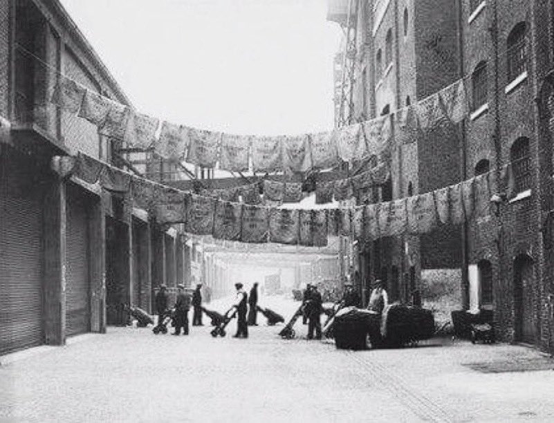 A couple of views of ‘Blood Alley’ in West India Quays - dockers hands would be left bleeding and raw after handling the rough hessian sacks containing sugar - after use, these would be hung up across the thoroughfare... #eastend#docks#London#History