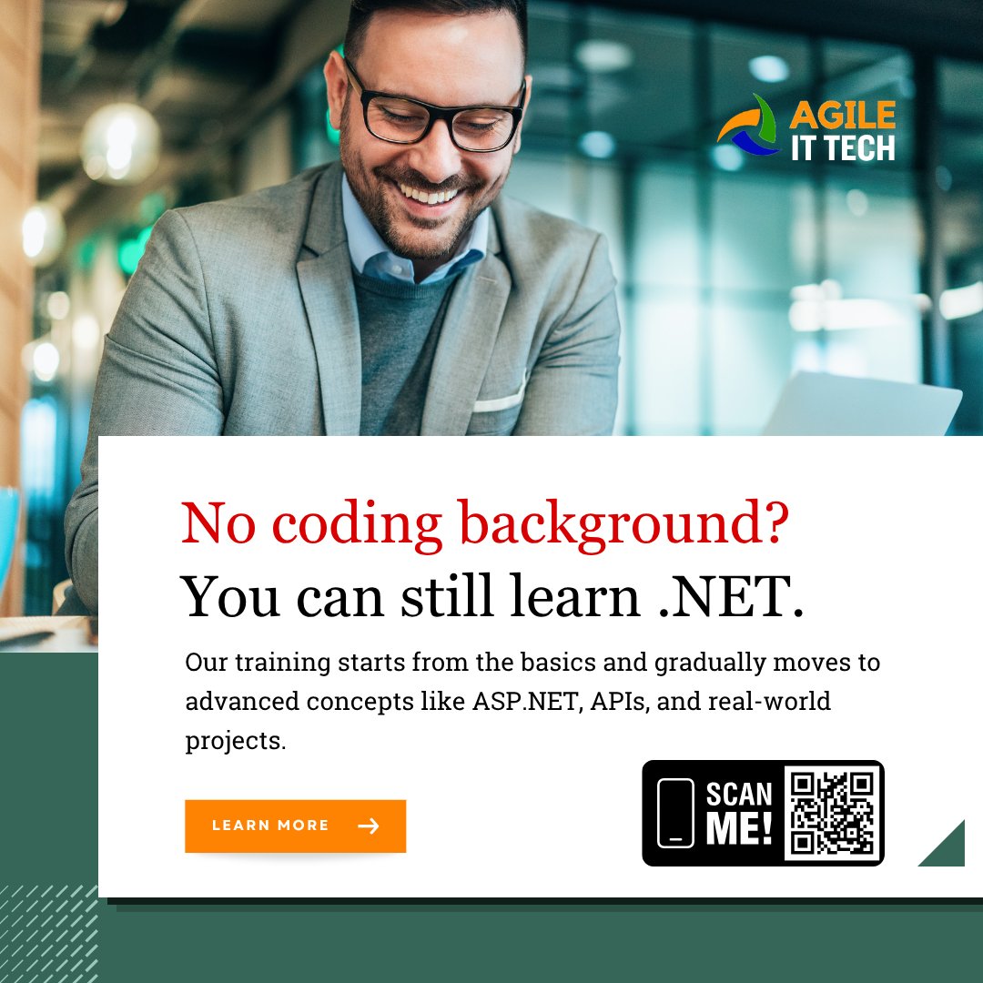 No coding background? You can still learn .NET. Our training starts from the basics and gradually moves to advanced concepts like ASP.NET, APIs, and real-world projects. Visit our website:- 𝐰𝐰𝐰.𝐚𝐠𝐢𝐥𝐞𝐢𝐭𝐭𝐞𝐜𝐡.𝐜𝐨𝐦 #dotnet #dotnetcore #agileITTech https://t.co/hFkzu6L2xN