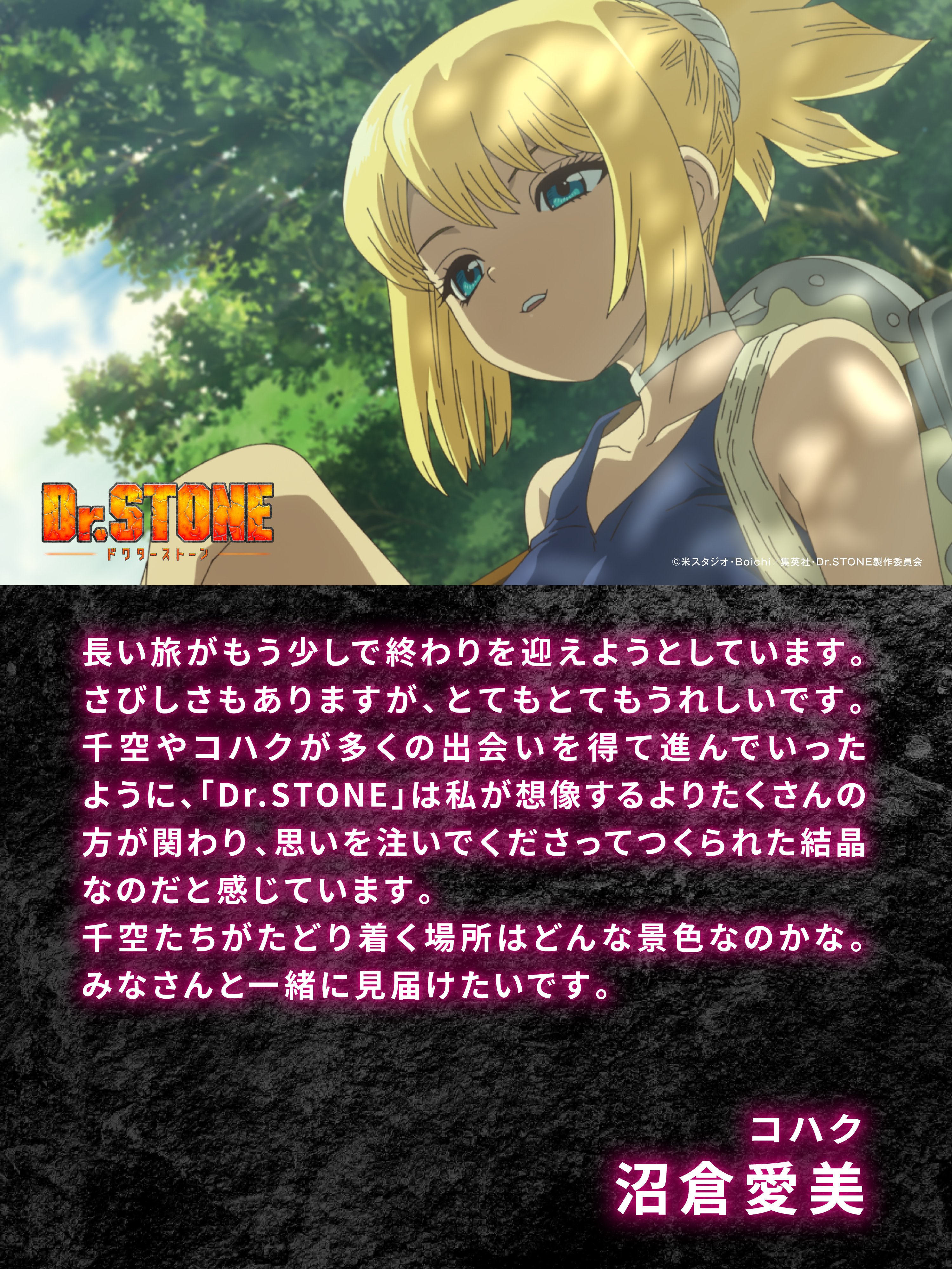 沼倉愛美 @numakura_manami · 52m もうすぐです🚀 #DrSTONE アニメ『Dr.STONE』公式|最終シーズン第3クール2026年4月2日(木)22時放送! @STONE_anime_off · 2h ╱ FINALプロジェクト 第1⃣弾 キャストコメント🚀 \ TVアニメ「Dr.STONE」シリーズ出演キャストの皆さんから 最終章に向けたコメントが到着! 本日は コハク 役 #沼倉愛美 さん からのコメントを公開💬 🔽FINALプロジェクト特設サイトでも公開中dr-stone.jp/special/finalp…Ws3 #DrSTOSlO 20 83 5.4K