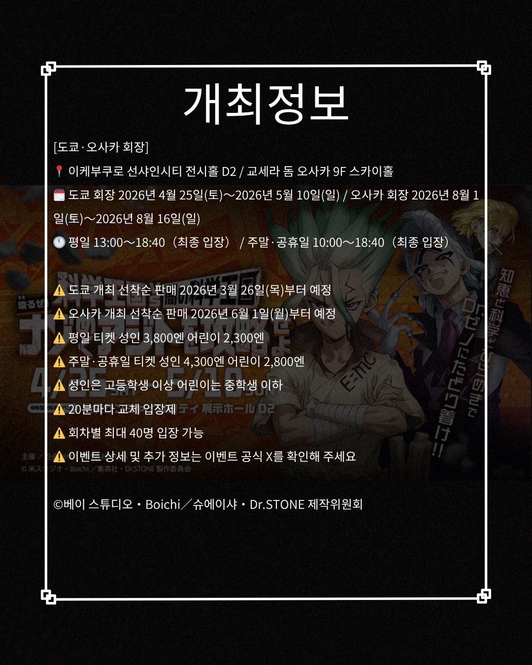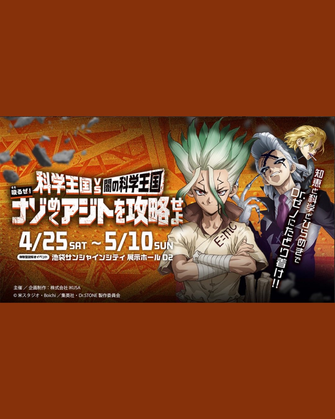 애니맵스 @EaH5lHhxyp99761 · 30m TV 애니메이션 「닥터스톤」 체험형 수수께끼 풀이 이벤트 〖과학왕국 VS 어둠의 과학왕국~두근거리는 수수께끼 아지트를 공략하라~〗 개최 확정! #닥터스톤 #DrSTONE #수수께끼풀이이벤트 #애니메이션이벤트 #오리지널굿즈 1 12