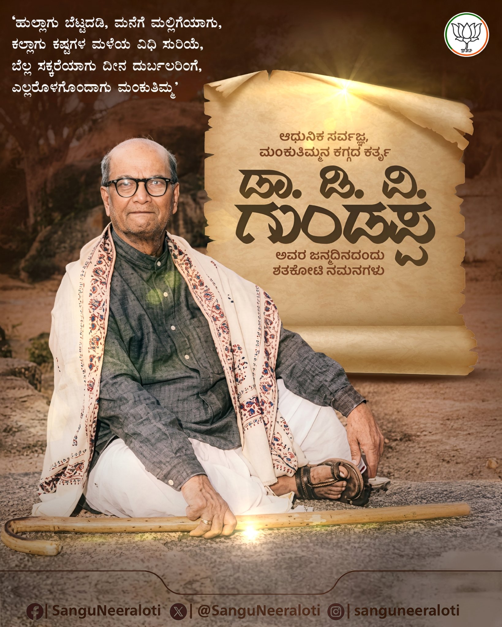 ಬಹುವಿದ್ಯೆ ಬಹುತರ್ಕ ಬಹುನೇಮ ಬೇಕಿಲ್ಲ | ವಹಿಸೆ ಜೀವನಭರವನದು ಹಗುರೆನಿಪವೊಲ್ || ಸಹನೆ ಸಮರಸಭಾವವಂತಃ ಪರೀಕ್ಷೆಗಳು | ವಿಹಿತವಾತ್ಮದ ಹಿತಕೆ – ಮಂಕುತಿಮ್ಮ | ಕನ್ನಡದ ಆಧುನಿಕ ಸರ್ವಜ್ಞ, ಮಹಾನ್ ವಿದ್ವಾಂಸ, ಪದ್ಮಭೂಷಣ ಪುರಸ್ಕೃತ ಡಾ. ಡಿ. ವಿ. ಗುಂಡಪ್ಪ ಅವರ ಜನ್ಮದಿನದಂದು ಗೌರವಪೂರ್ವಕ ನಮನಗಳು. #DVG #DVGundappa