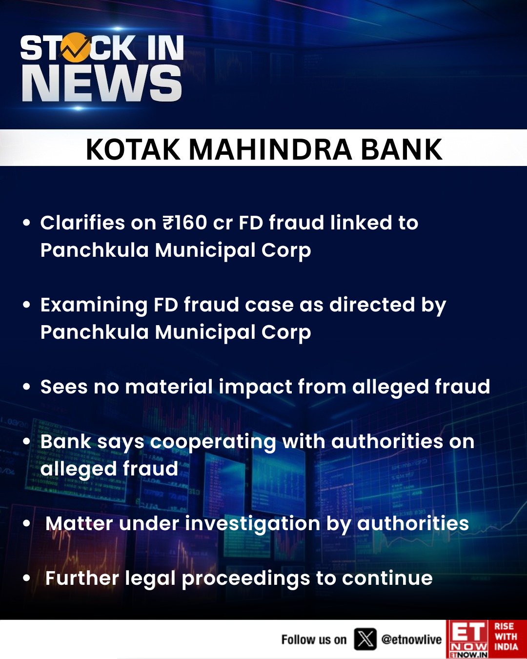 #StockInNews | Kotak Mahindra Bank clarifies on ₹160 cr FD fraud linked to Panchkula Municipal Corp The bank examining FD fraud case as directed by Panchkula Municipal Corp and sees no material impact from alleged fraud @KotakBankLtd #StockMarket #FD #fraud