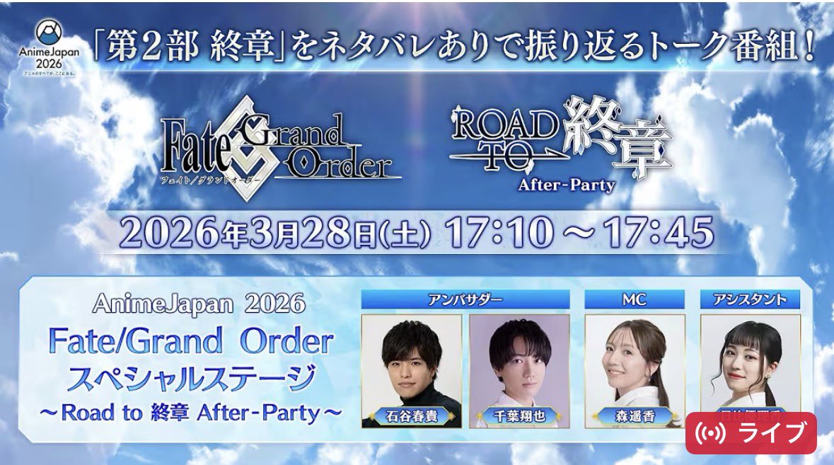Nアニメ&ニコニコアニメ公式/配信情報や🎁も!! @nicoanime_PR · 5m ✨️「AnimeJapan 2026」ステージ生中継✨️ Fate/Grand Order スペシャルステージ ~Road to 終章 After-Party~ ⏰️3/28(土)17:10~ 🔻視聴はこちらlive.nicovideo.jp/watch/lv350007…0 🔻出演者 石谷春貴 千葉翔也 森遥香(MC) 日比優理香 #FGO #AJ202@6 @animejapan_aj 3 1 1.1K
