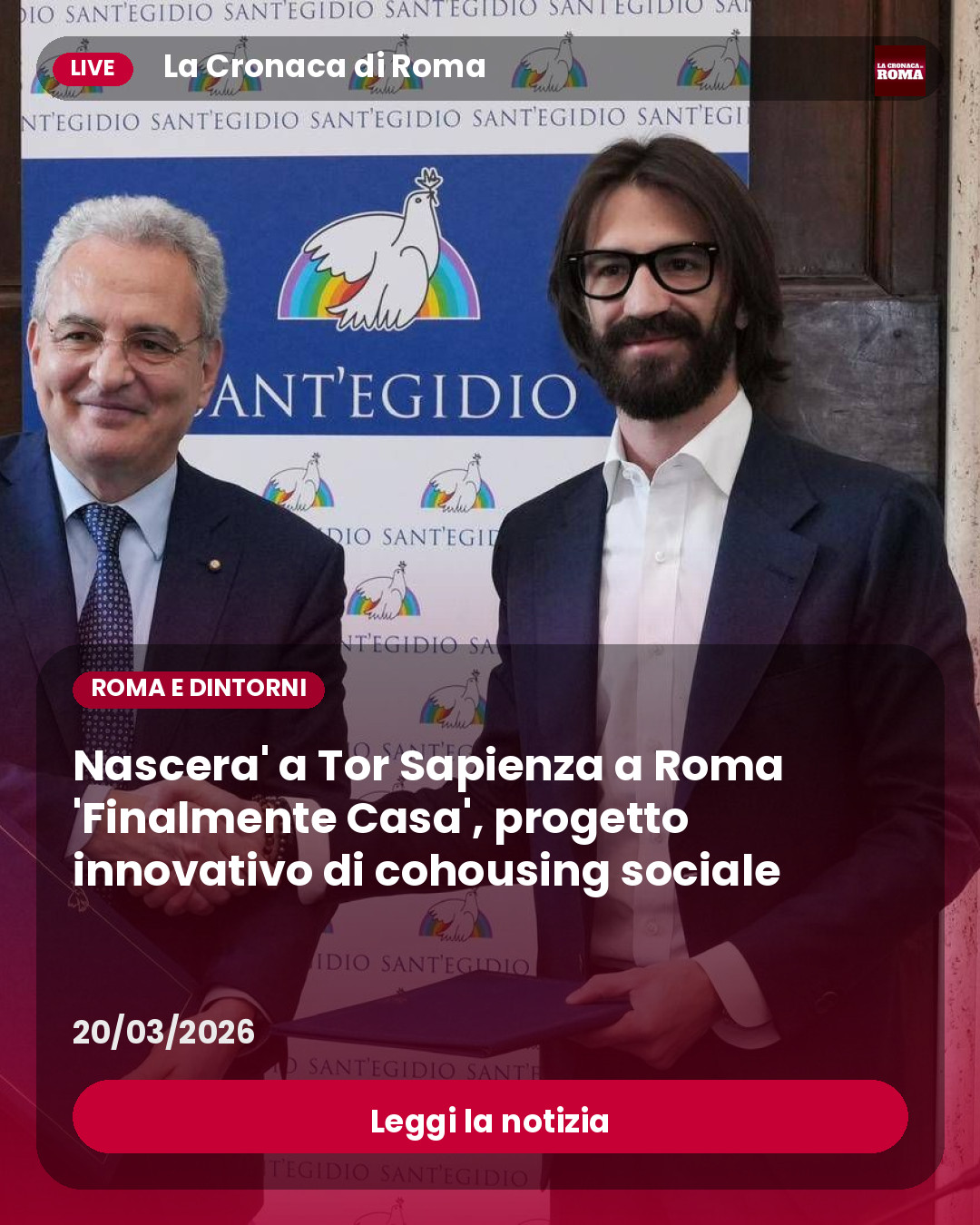 Leggi la notizia : (Adnkronos) – Offrire spazi abitativi a chi ne ha bisogno, ma anche favorire dialogo e inclusione. ‘Finalmente Casa!’ progetto innovativo di cohousing sociale, nasce dalla volontà di sviluppare a Tor Sapienza, periferia… #TorSapienza #FinalmenteCasa #cohousing