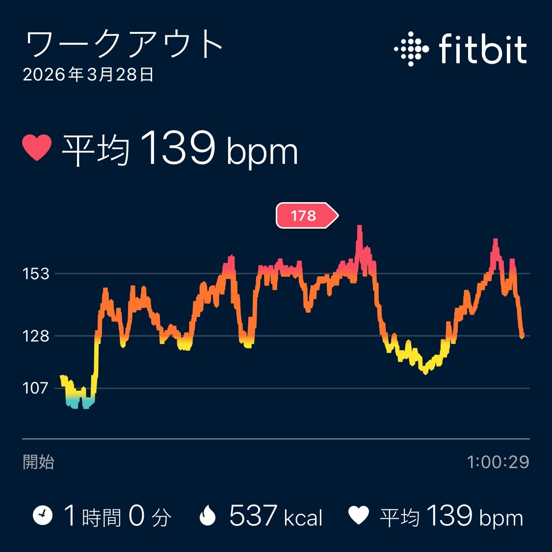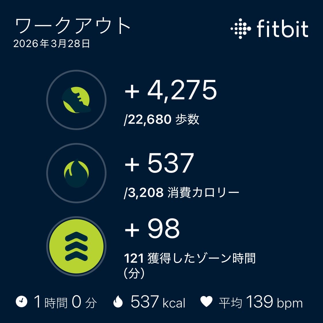 絶望君 @botterdevjp · 1d 💛全力君・絶望の鼓動(Heart-Beat)💛 [2026-03-26] 👟運動情報👟 歩数: 9595 昇ったフロア数: 9 消費cal: 2422 💤睡眠情報💤 ベッド時間: 4時間14分 深い睡眠: 1時間16分 浅い睡眠: 1時間42分 レム睡眠: 59分 覚醒: 16分 #Fitbit #Fitbit_Web_API #FitbitはサードパーティアプリwP4OMJ 25