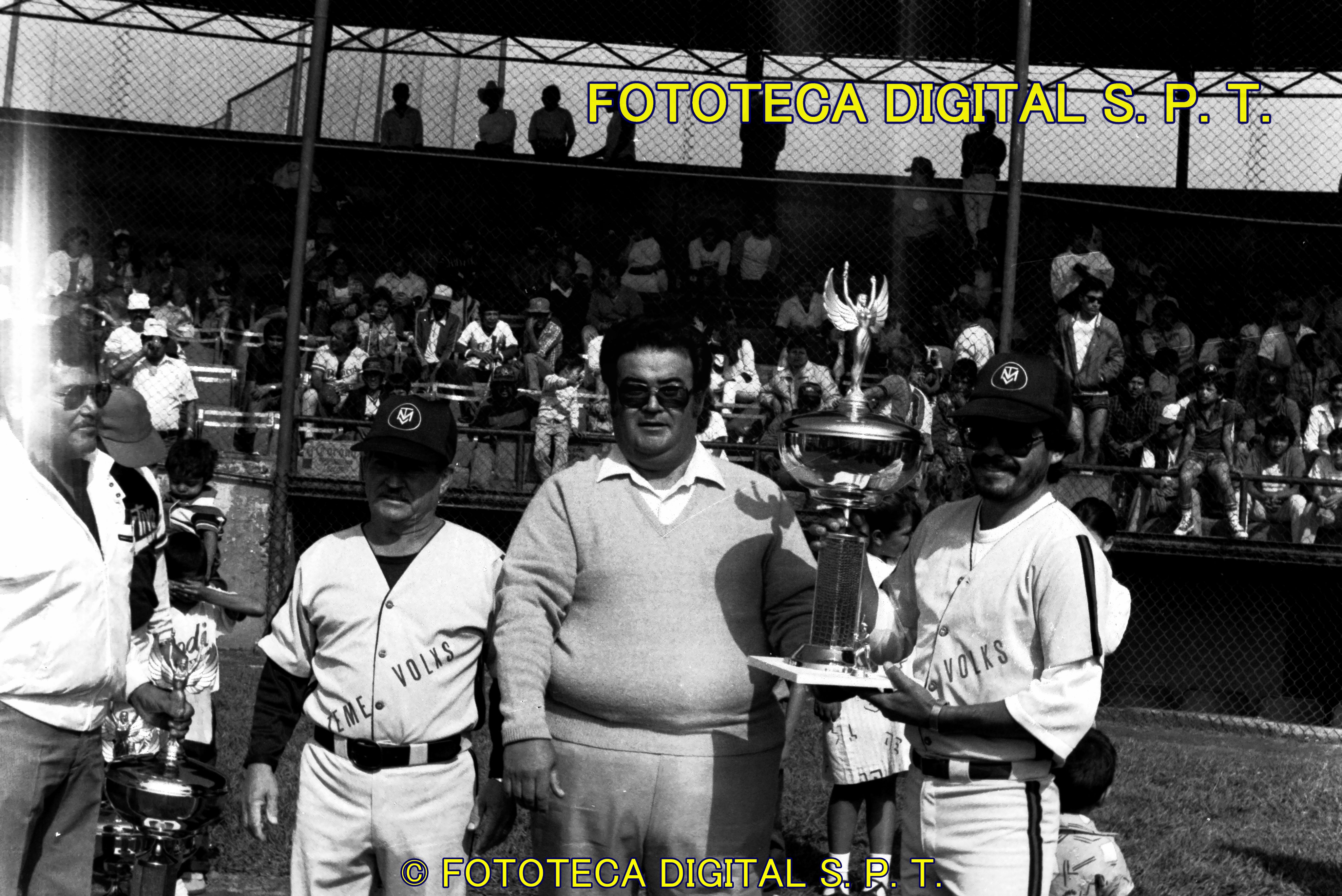 Autoridades municipales hacen entrega de los trofeos de campeón a los equipos vencedores de la liga de béisbol, 88-89.