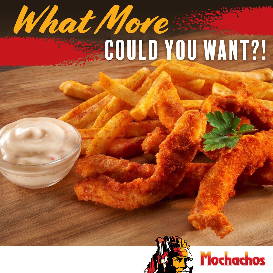 The spice is too nice when you order a side of Mochachos chicken strips! Get 6 tender and tasty fried chicken strips with chips and dip for only R54.90! #Chickenstrips#Friedchicke