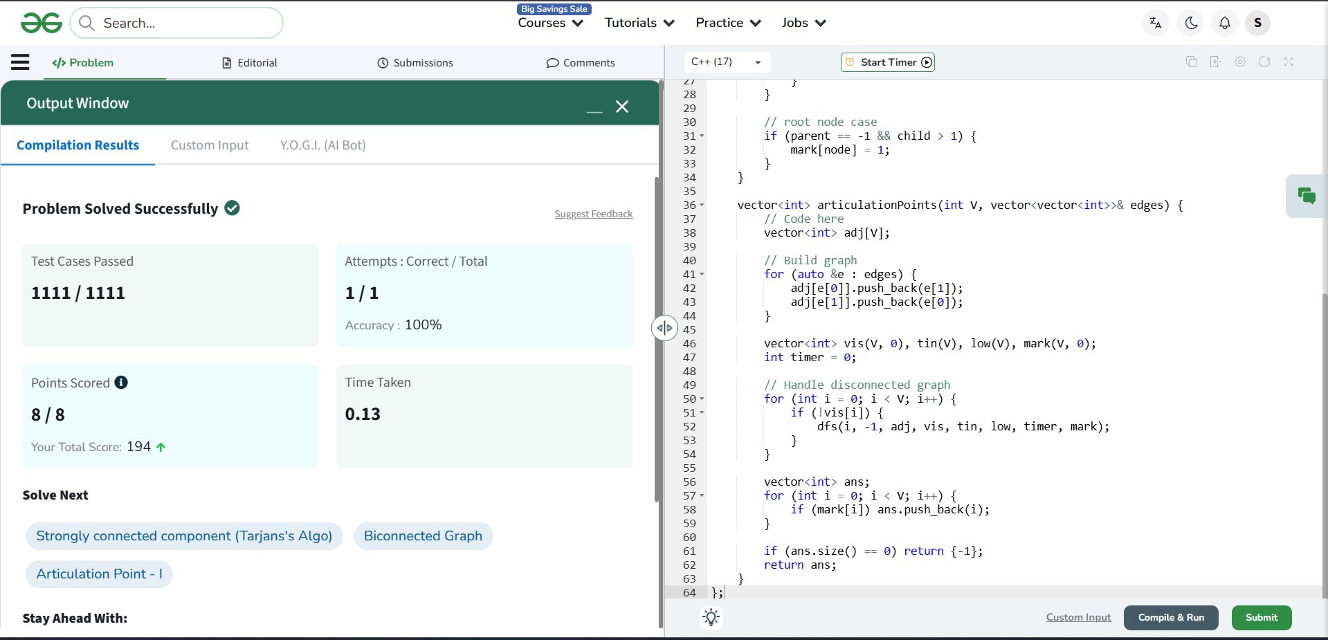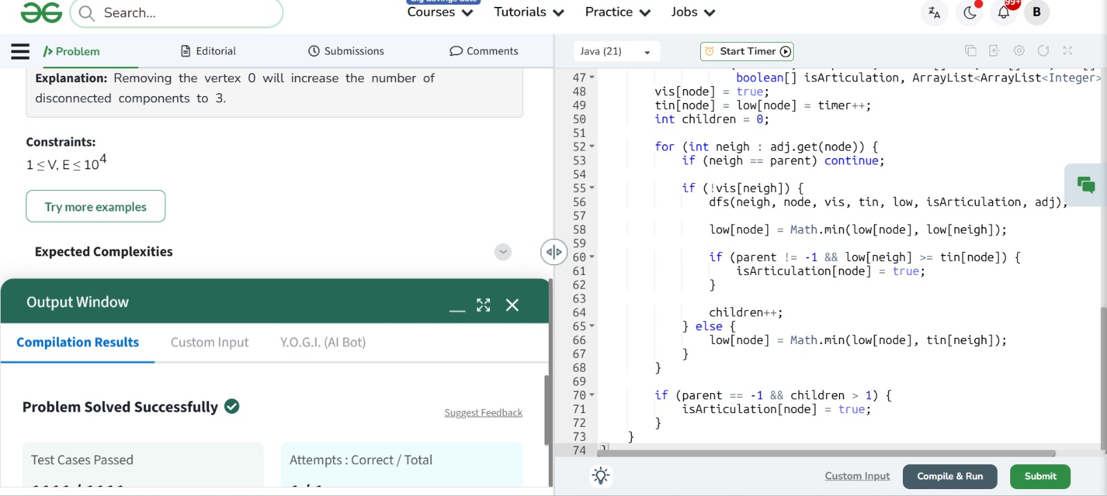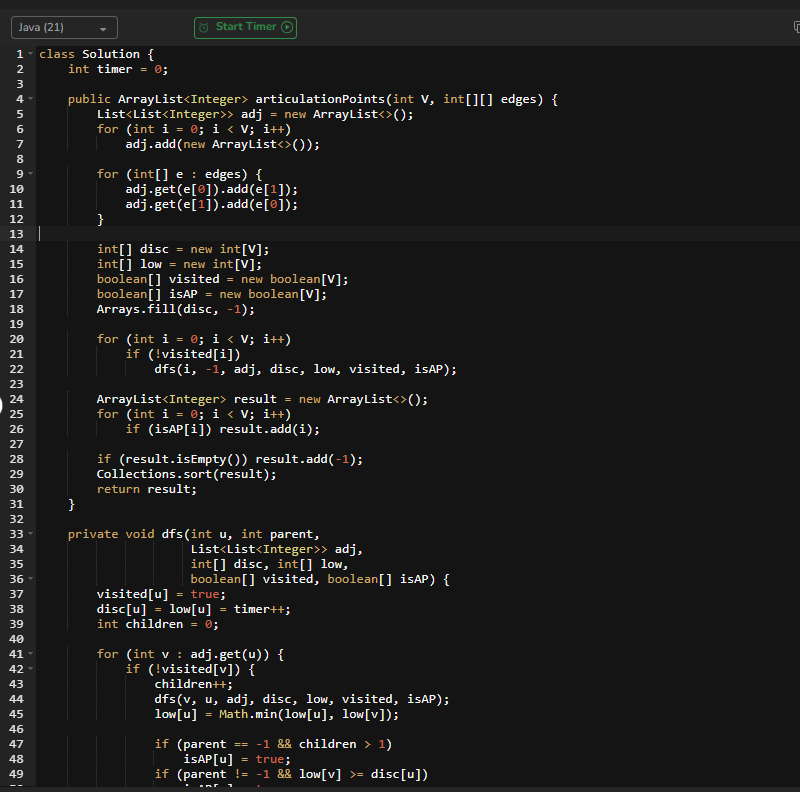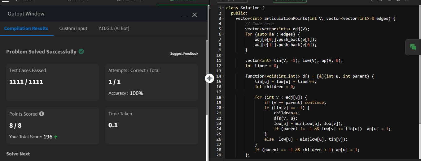 Tarjan's Algorithm — disc[] + low[] in one DFS pass ✅ 1111/1111 test cases ✅ 100% accuracy ⚡ 0.42s runtime 🕐 Time: O(V+E) | 💾 Space: O(V+E)