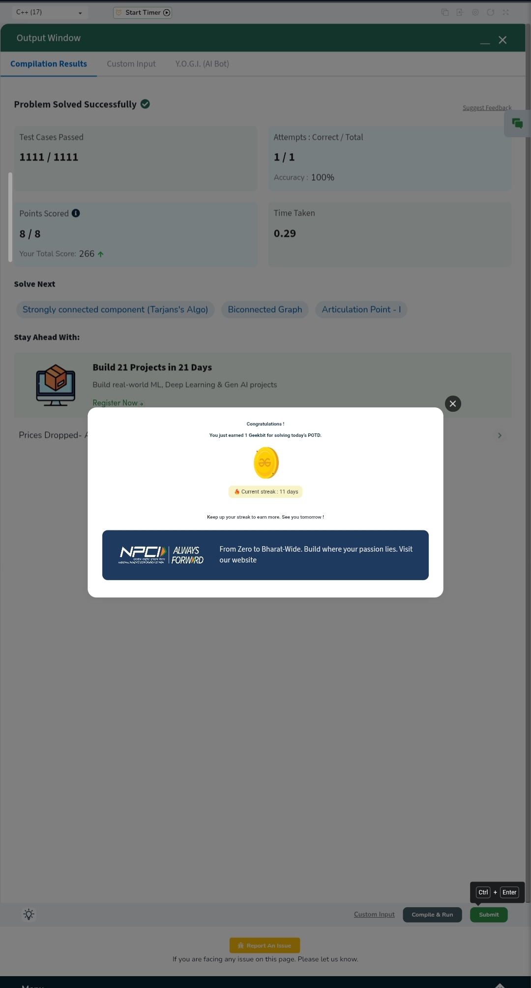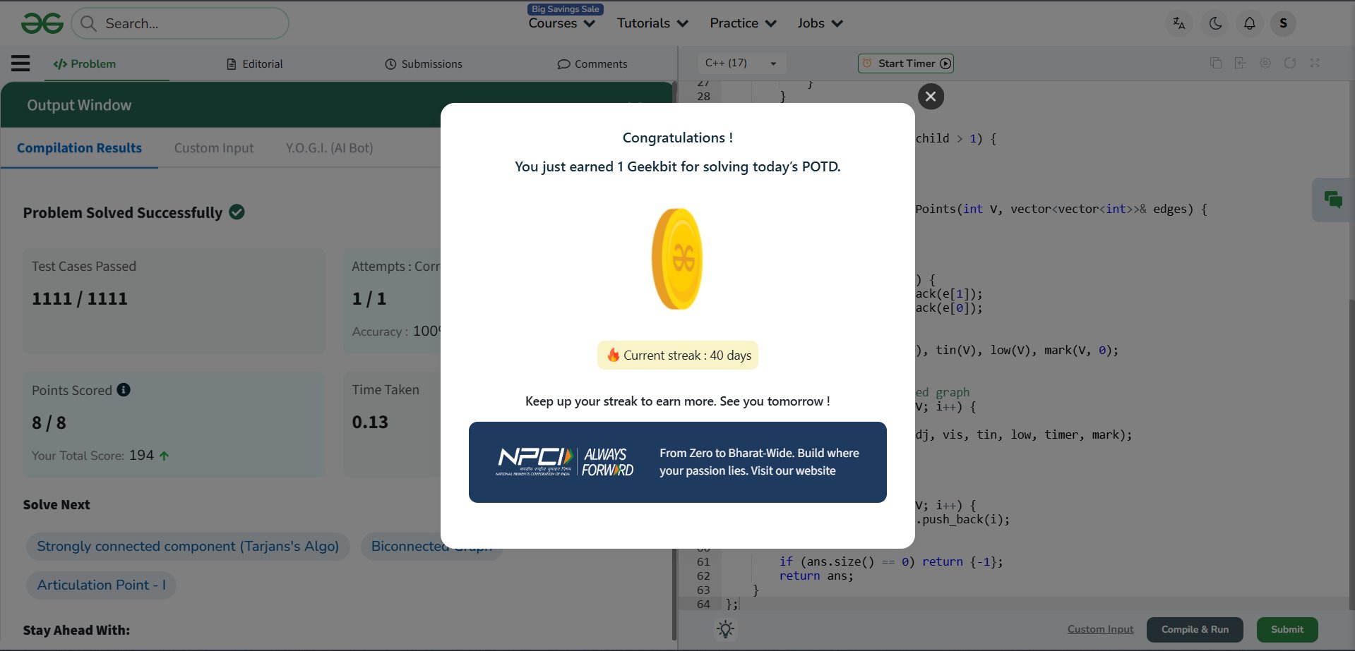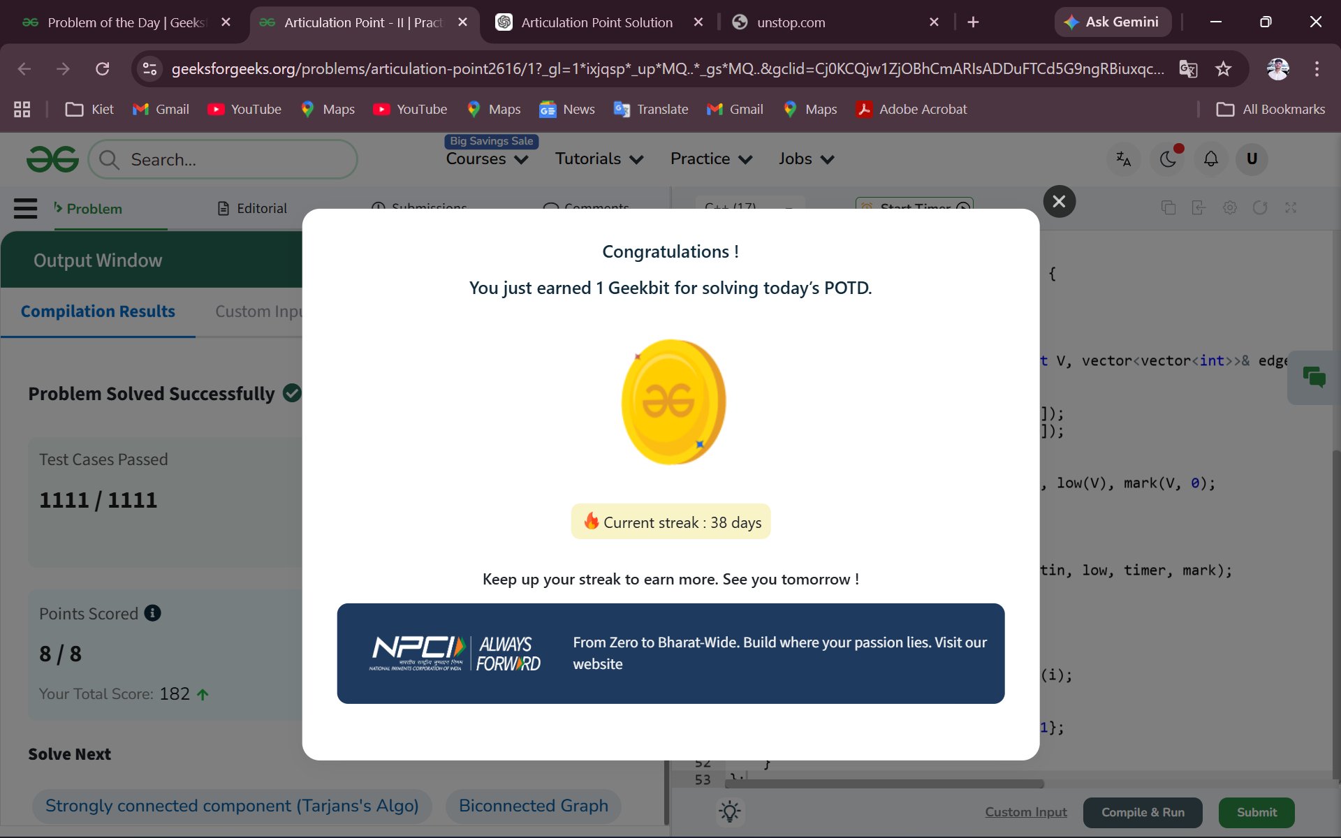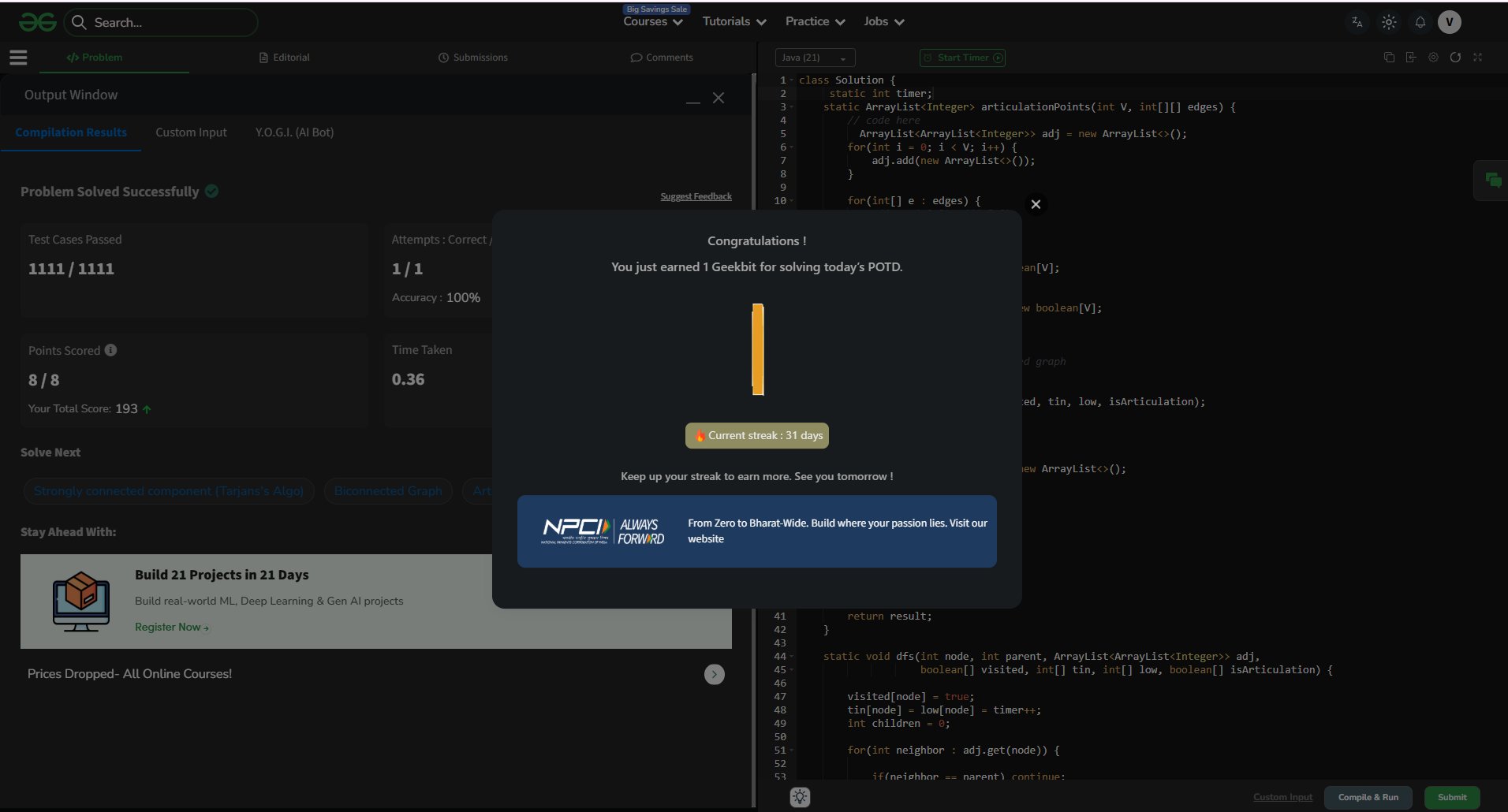 Tarjan's Algorithm — disc[] + low[] in one DFS pass ✅ 1111/1111 test cases ✅ 100% accuracy ⚡ 0.42s runtime 🕐 Time: O(V+E) | 💾 Space: O(V+E)