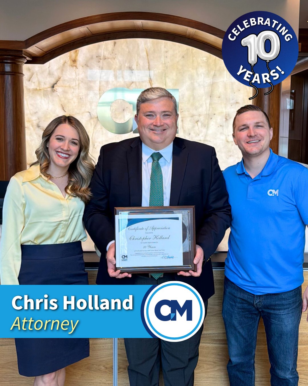 Please join us in congratulating Workers' Compensation Attorney Christopher Holland on 10 years with the Carter Mario Law Firm. Thank you for all that you do, Chris, and congratulations on a decade of dedicated work fighting for the injured! 🎉��