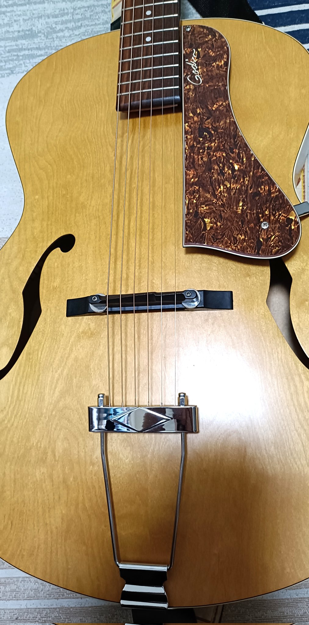 カツオノ🍜🎧🗼 @tokyo_katsuono · Jun 12, 2025 ズレてしまったフロートアジャストブリッジの位置合わせ(開放弦音=12fピッチ音)がやっと出来た😅 骨が折れた… クロサワ楽器店さん、先にブリッジの仕様を教えておいて欲しかったゎ🎸 #GodinGuitar #Godin_Guitar #アーチトップ #5thAvenuejR 64